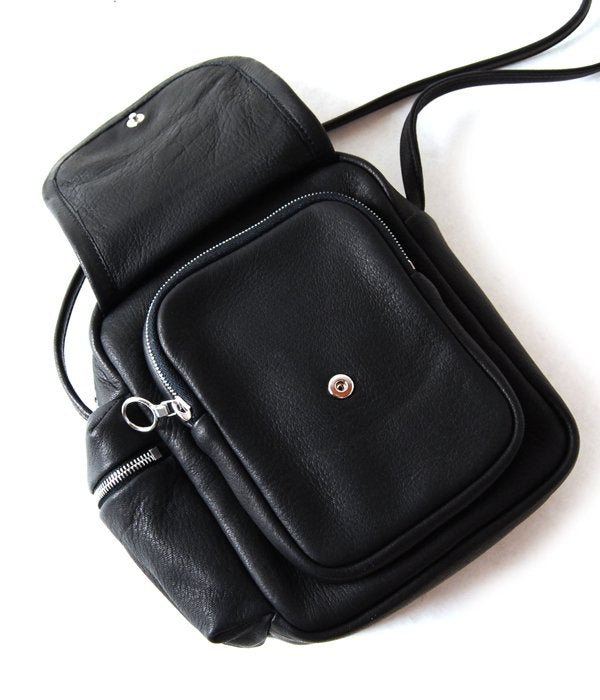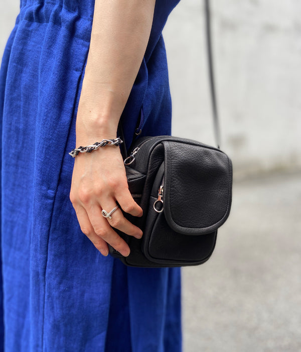 丈夫で柔らかいディア・レザーで作られたミニショルダーバッグ。ポケットをたくさん備え、コンパクトな見た目とは裏腹に収納力アリ。