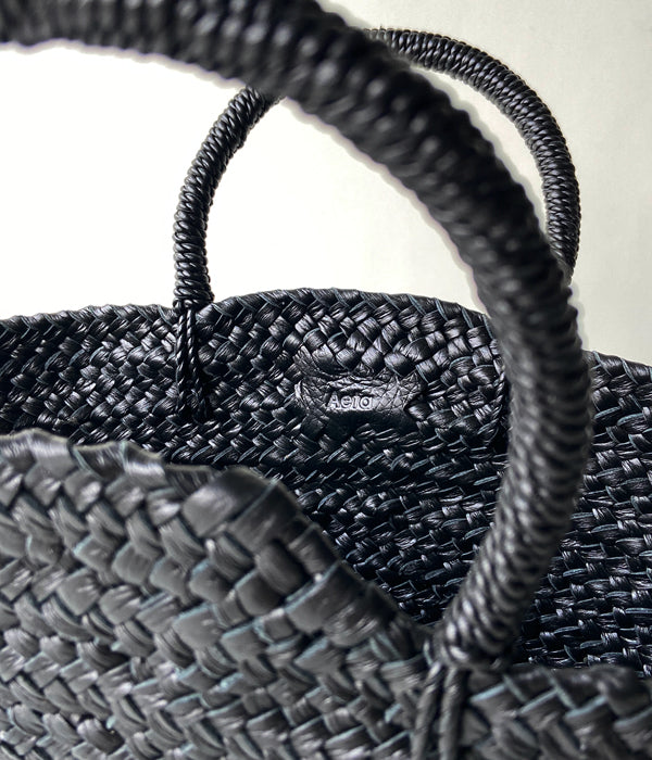 AetaからOVAL BOTTOM BASKET S(BLACK)が入荷しました。春夏のイメージが強いマルシェかごをシーズンレスで使えるよう上質なカウレザーを使って作成。貼り合わせた革を編み込んで成形しているため内側まで美しく、使い込むことにより革の風合いが楽しめるバッグです。