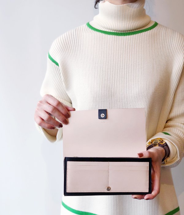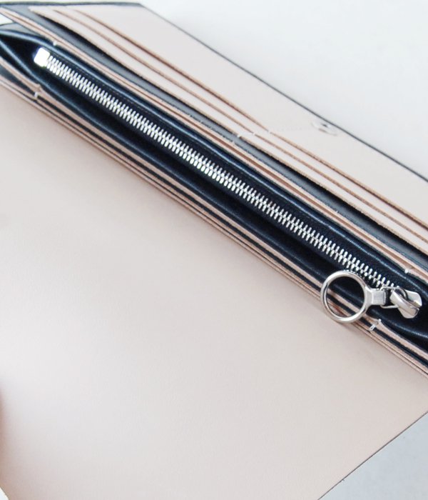 柔らかなキップレザーと清潔感のあるホワイトヌメを貼り合わせ、繊細に組み立てたウォレット。収納力抜群で、機能性・デザイン性も完璧な仕上がりとなっています。