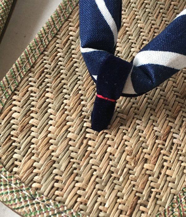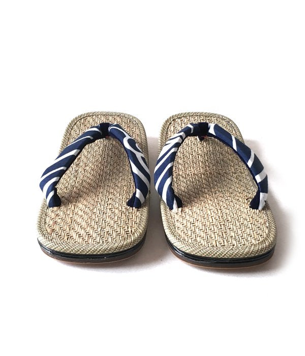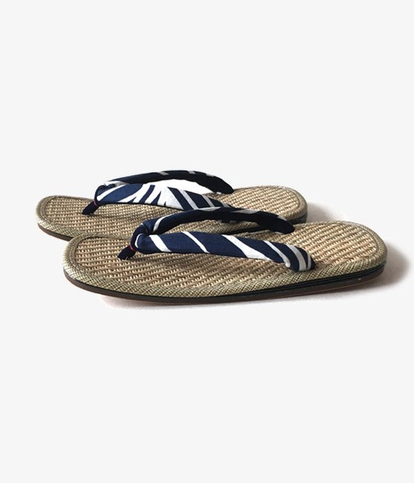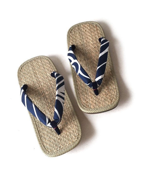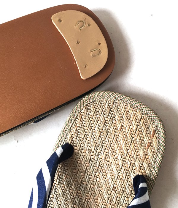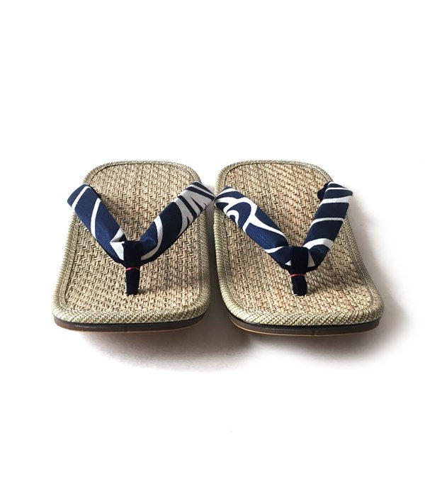 畳などにも使用されている天然素材の馬蘭草を使用した、汗ばむ時期に優れた吸湿性を誇る履き心地の雪駄です。こちらは踵裏部分に後金が付く本格仕様。鼻緒部分は抜染の手法で波頭模様をあしらった涼しげなデザイン。