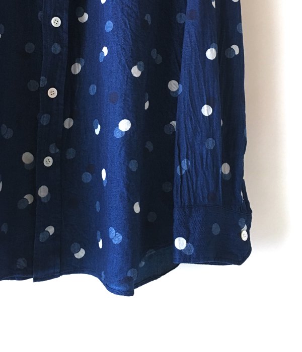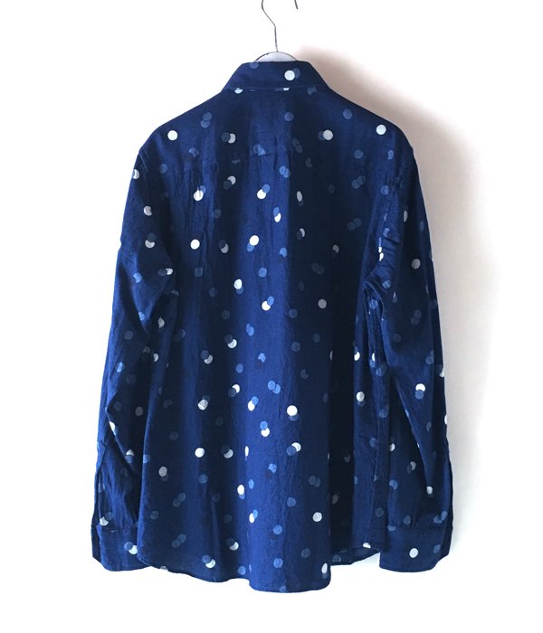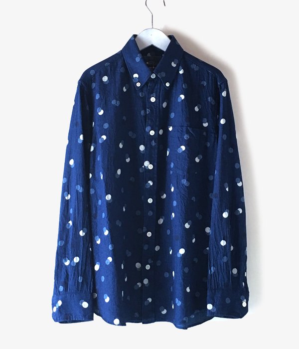 濃淡鮮やかな跳ねる水玉を抜染の技法で表現したB.Dシャツ。インディゴ糸を使用したツイルコットン素材で肌触りの良さが特徴。T-SHIRTSに羽織るだけで様になるデザイン性の高い水玉シャツ。