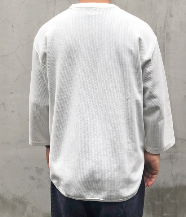 blurhms ROOTSTOCKから、ROUGH&SMOOTH THERMAL OVER NECK LSが入荷しました。表地は凹凸のある質感、裏地はフラットに仕上げたこだわりのワッフル生地を使用したベースボールTEE。素材由来の光沢感のある表情と、洗いをかけたこなれた雰囲気がポイントです。7~8分に仕立てた袖と、ラウンドした裾のラインが特徴的なデザイン。