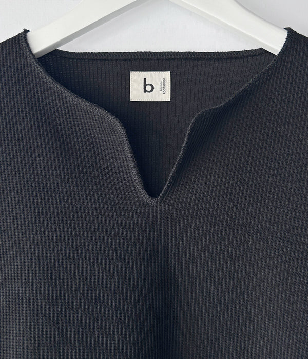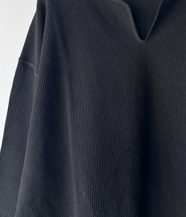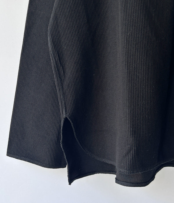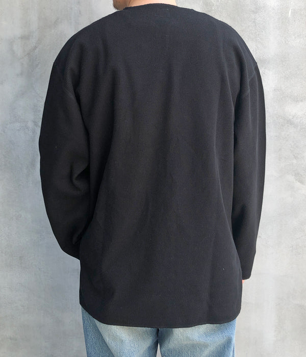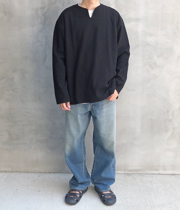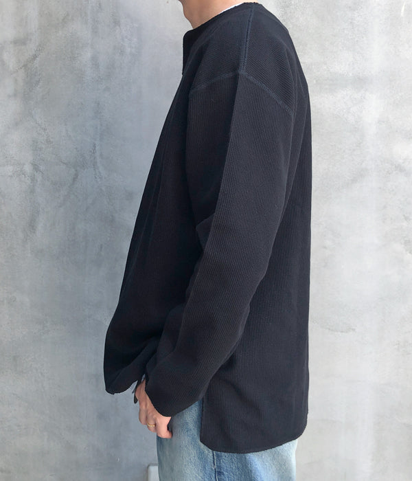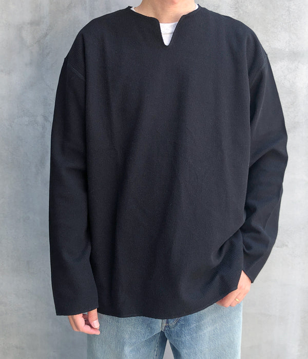 blurhms ROOTSTOCKから、ROUGH&SMOOTH THERMAL OVER NECK LSが入荷しました。表地は凹凸のある質感、裏地はフラットに仕上げたこだわりのワッフル生地を使用した、切込みの入ったオーバーネック仕立てのロングスリーブ。素材由来の光沢感のある表情と、洗いをかけたこなれた雰囲気がポイントです。