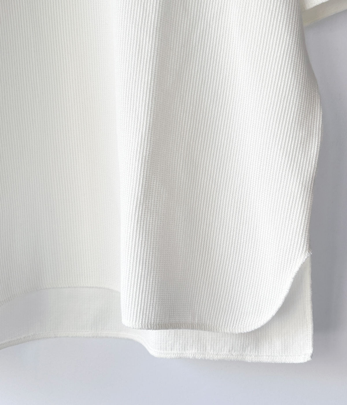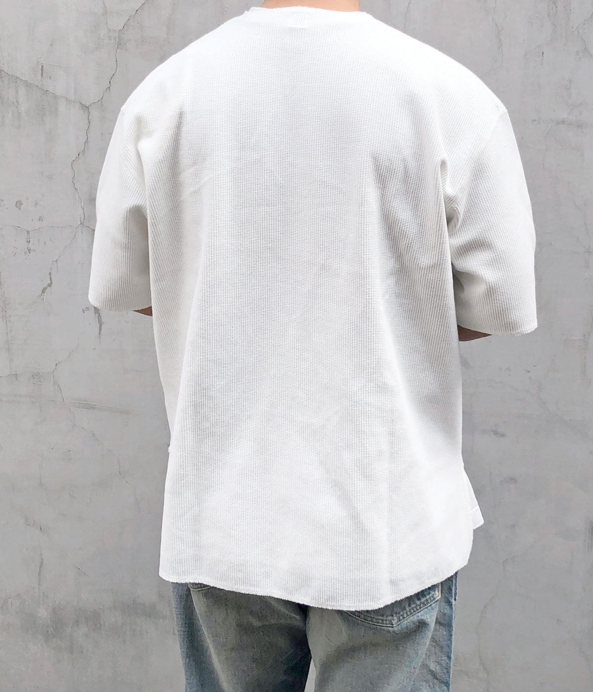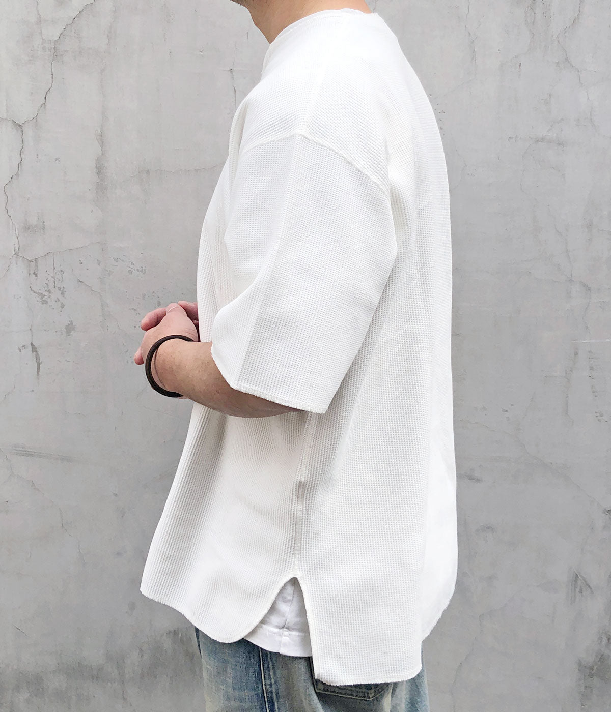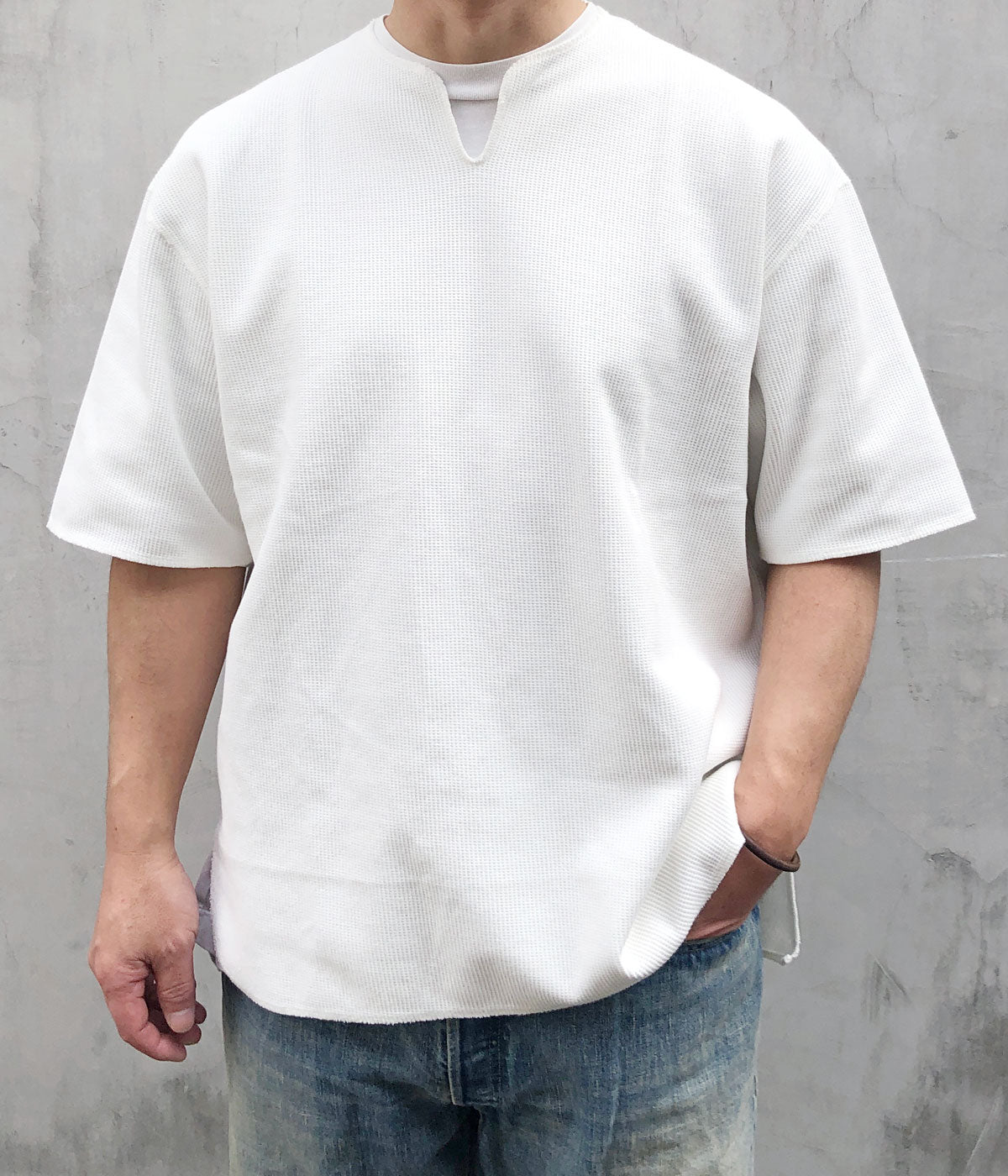 blurhms ROOTSTOCKから、ROUGH&SMOOTH THERMAL OVER-NECKが入荷しました。表地は凹凸のある質感、裏地はフラットに仕上げたこだわりのワッフル生地を使用した、切込みの入ったオーバーネック仕立てのショートスリーブTシャツ。素材由来の光沢感のある表情と、洗いをかけたこなれた雰囲気がポイントです。