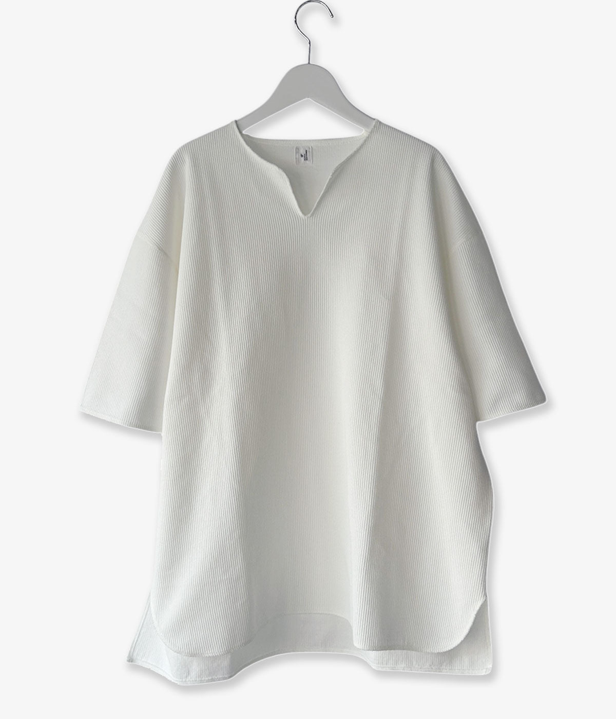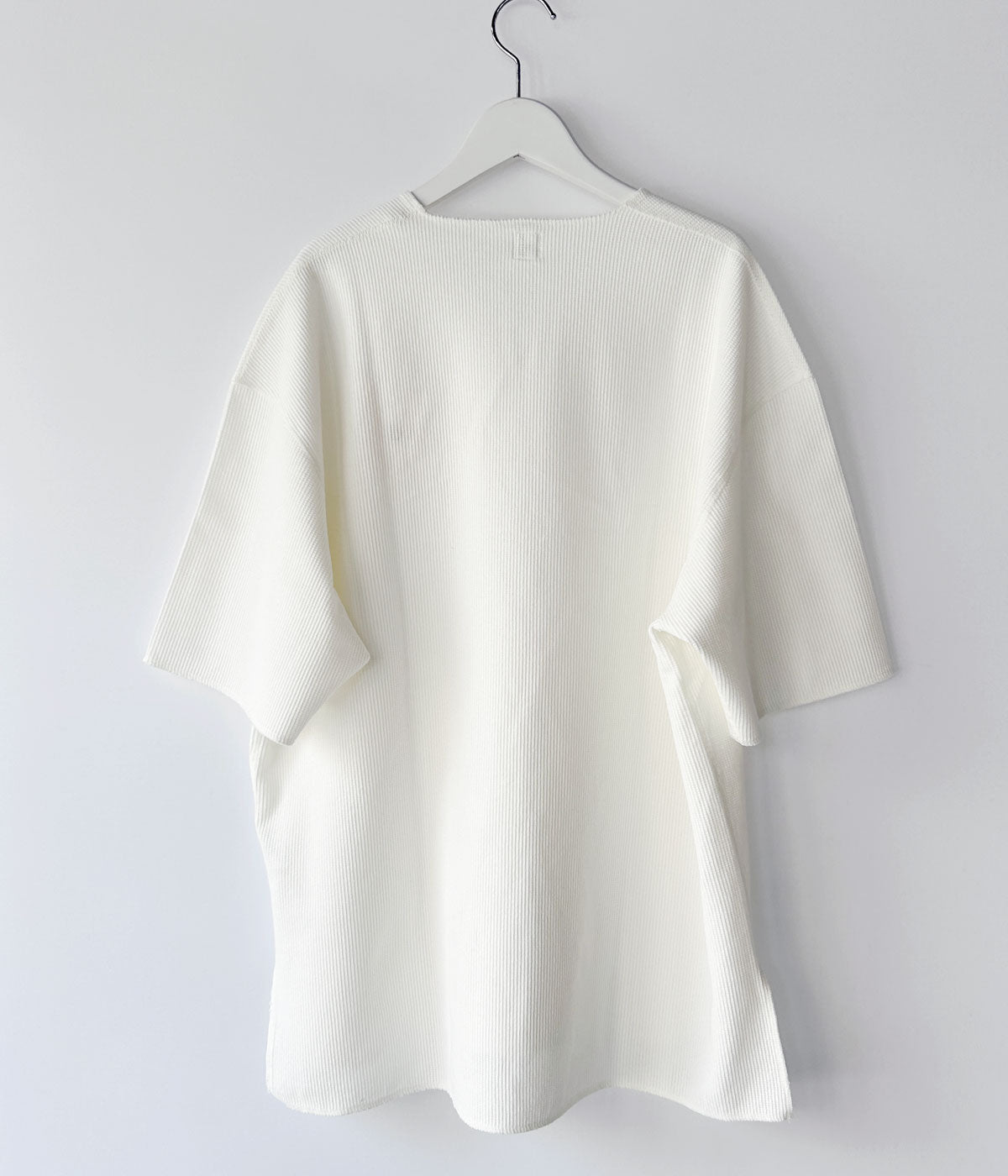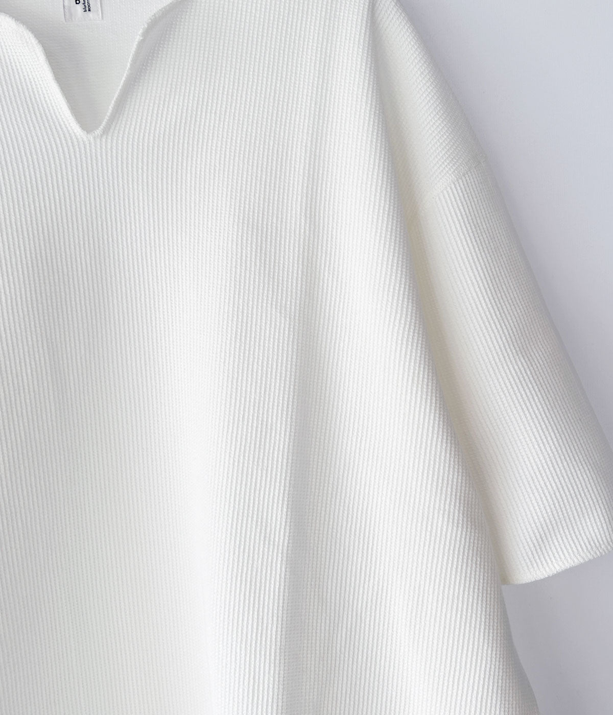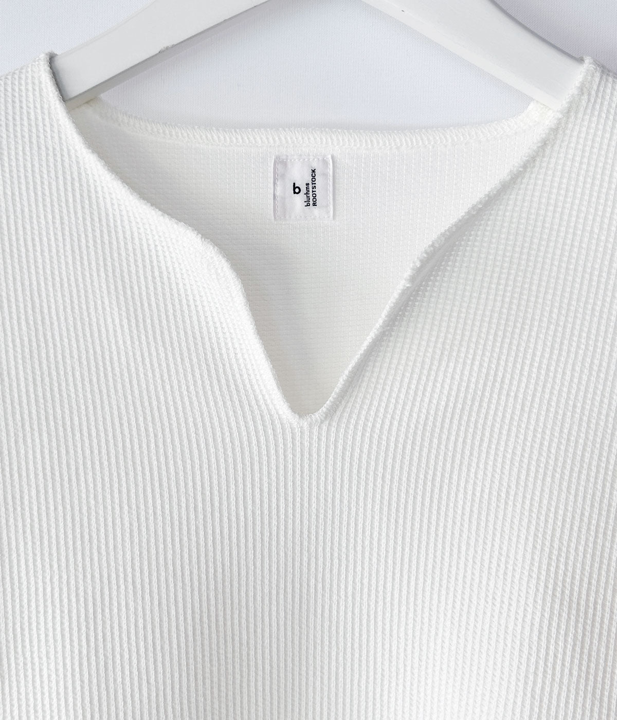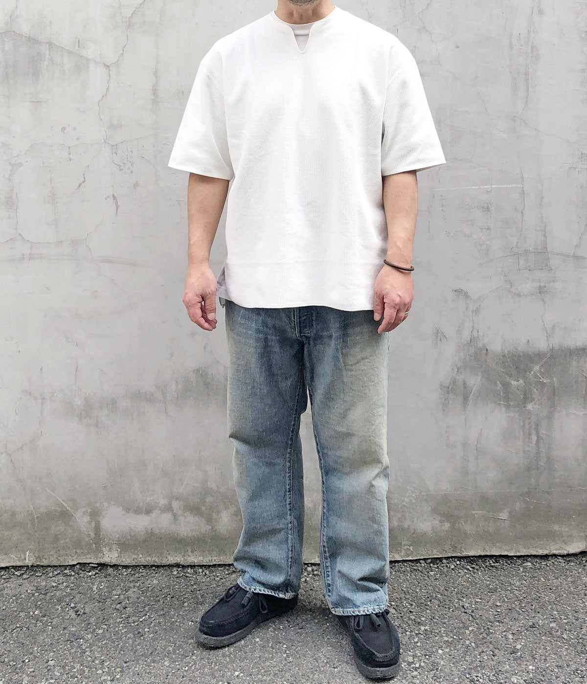 blurhms ROOTSTOCKから、ROUGH&SMOOTH THERMAL OVER-NECKが入荷しました。表地は凹凸のある質感、裏地はフラットに仕上げたこだわりのワッフル生地を使用した、切込みの入ったオーバーネック仕立てのショートスリーブTシャツ。素材由来の光沢感のある表情と、洗いをかけたこなれた雰囲気がポイントです。