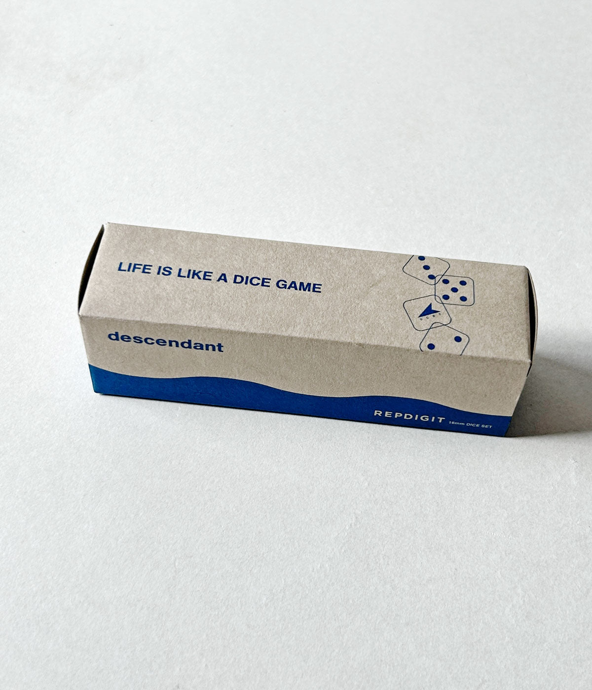 DESCENDANTから、REPDIGIT 16mm DICE SETが入荷しました。1の目をCETUSロゴにアレンジしたサイコロを5個セットで。TEAL × PURPLEによるカラーリングがとてもきれいです。携行用にリサイクルレザー製のDESCENDANTロゴ入りダイスケースを付属。
