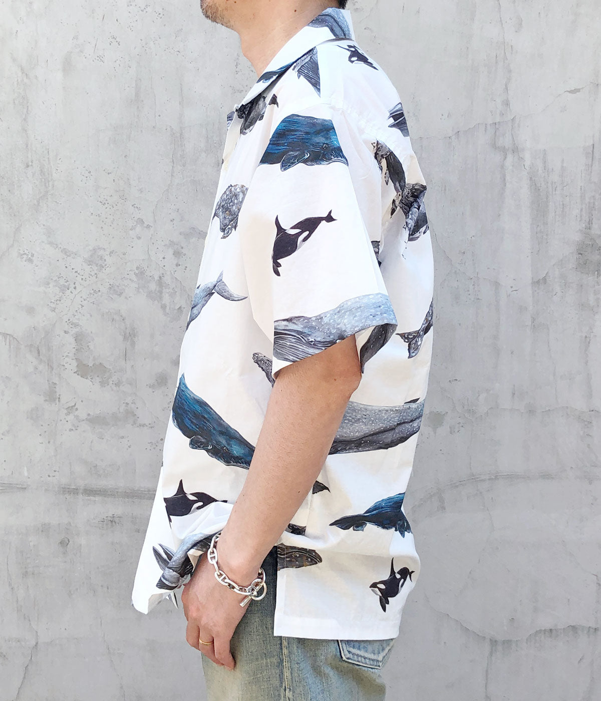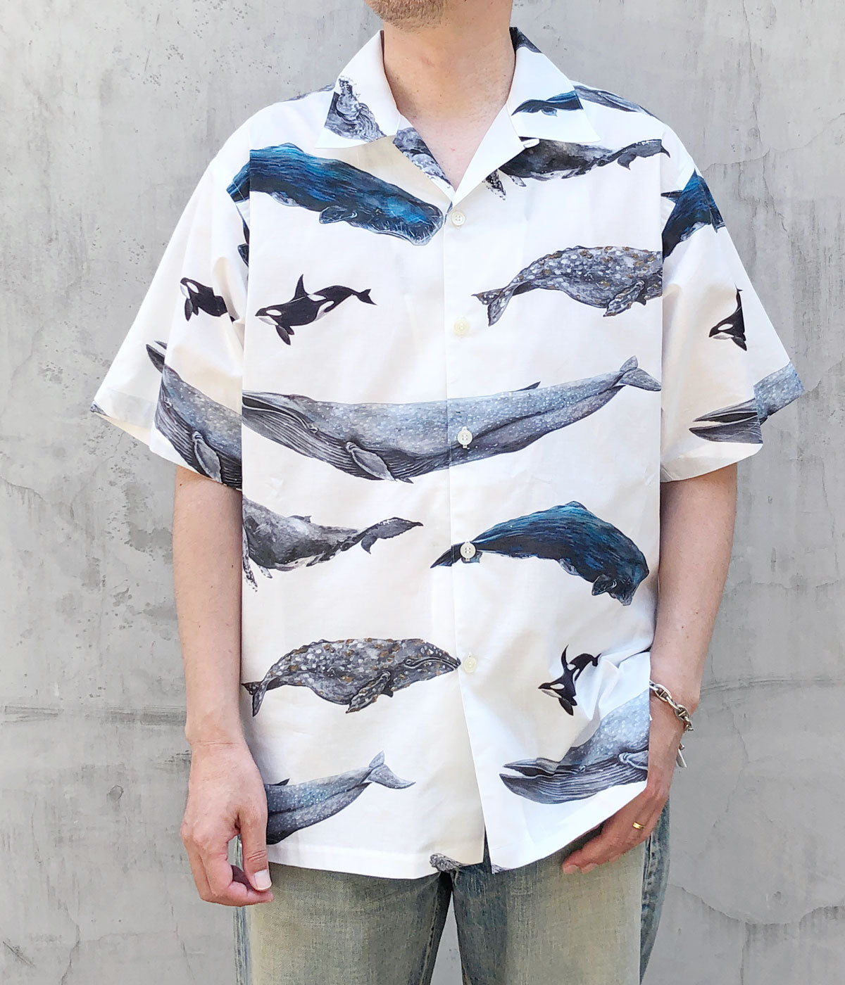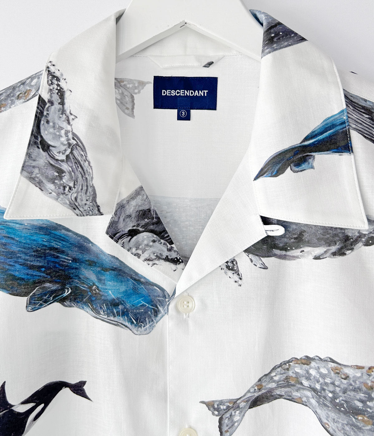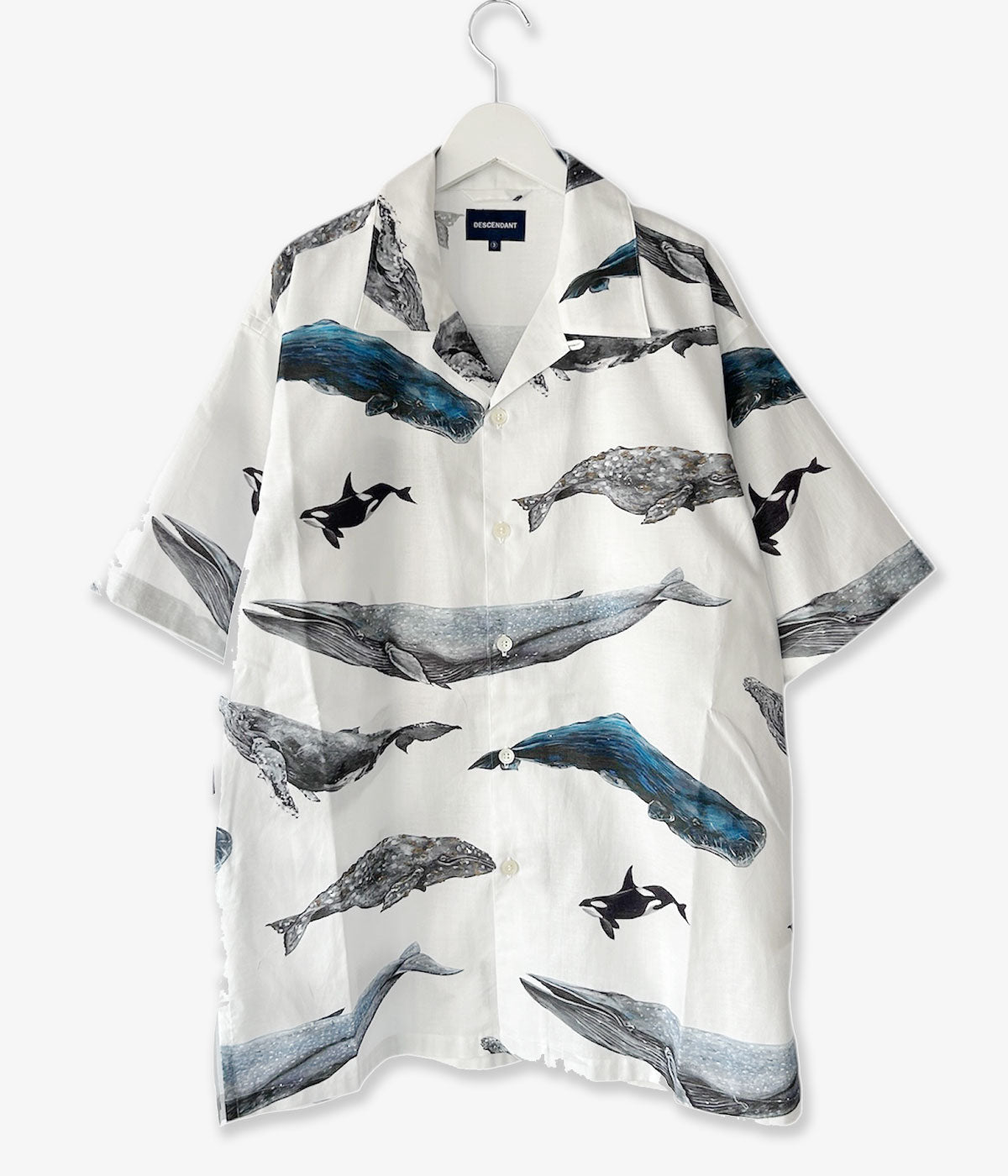 DESCENDANTから、SEAFARERS TEXTILE SS SHIRTが入荷しました。マッコウクジラや、シロナガスクジラ等の5種類のクジラをプリントした平織りコットン製のオープンカラーシャツ。裾にスリットが入り、アームホール広めのゆったりとしたシルエット。DCDTらしいダイナミックなデザインの1着です。
