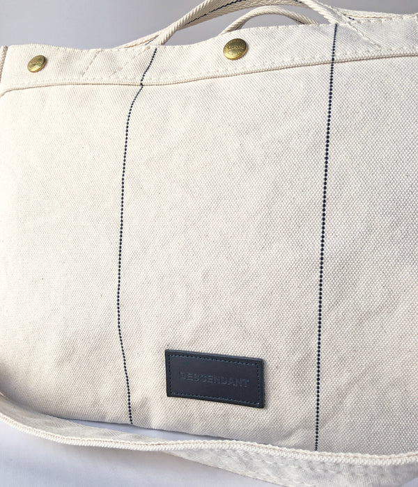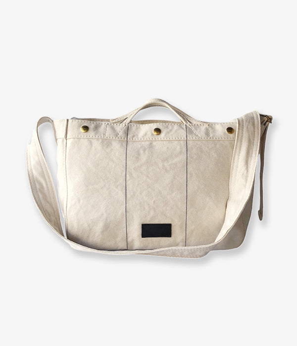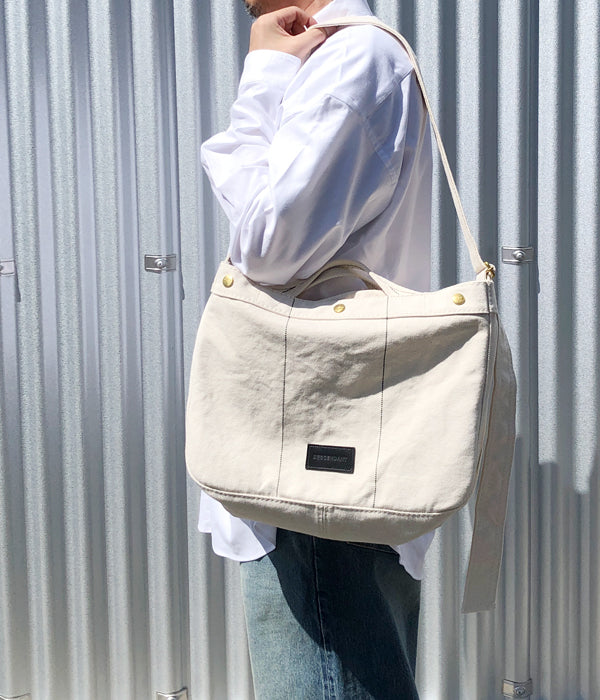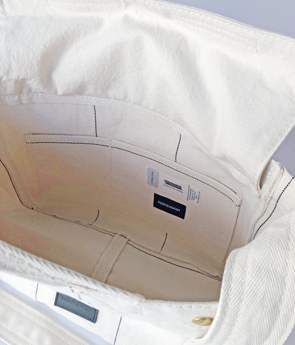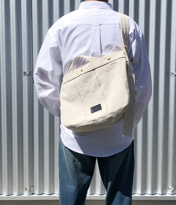 DESCENDANTから、SHOULDER BAG raregemが入荷しました。raregem別注によるショルダーバッグです。厚手の8号帆布を使用し、ハンドル付きのデザインで仕立てました。トップのカバーは真鍮製のスナップボタンで留めることができます。2か所のインナーポケット、BOX LOGOのレザーパッチがポイント。