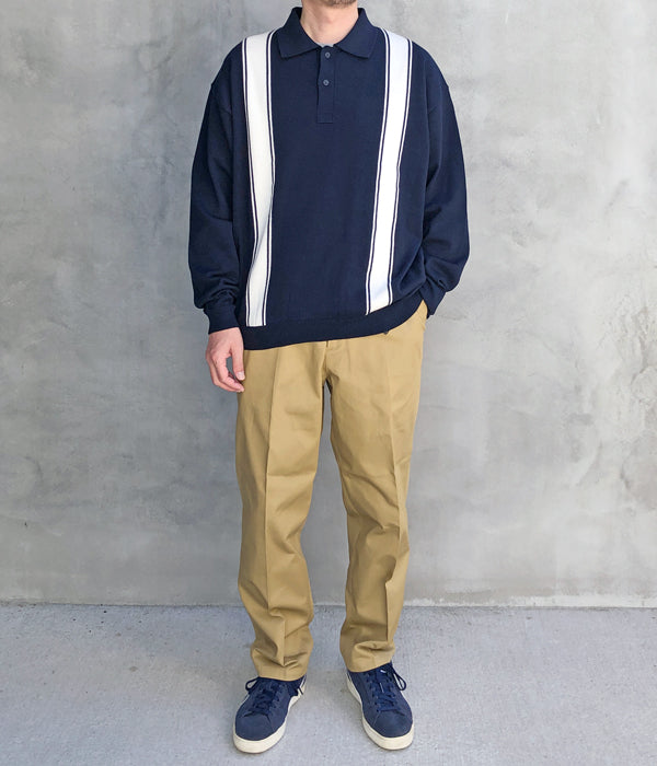 DESCENDANTから、SPIDER KNIT POLOが入荷しました。ハイゲージ編みのコットンニット素材を使用したロングスリーブポロシャツです。前見頃にデザインしたストライプ模様がポイント。右袖にDESCENDANT BOX LOGOのパッチをワンポイント。