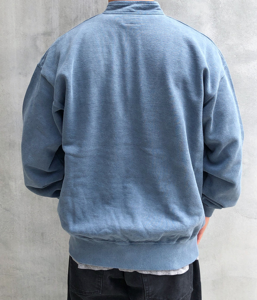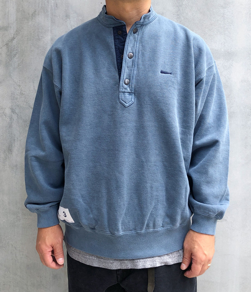 DESCENDANTから、VOIL HENLEY NECK PIGMENT DYEが入荷しました。定番のスナップボタン留めの、コットン裏毛素材によるヘンリーネックスウェット。厚手素材をピグメントダイ加工でくすんだ褪せた風合いに仕上げました。胸元のクジラの刺繍と、裾のサイズパッチでワンポイント。