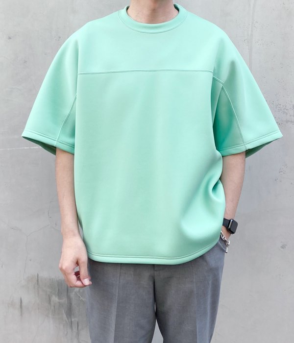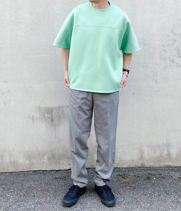 DIGAWELから、BONDING DOLMAN SLEEVE T-SHIRTが入荷しました。弾力性のあるボンディング生地を使用したドルマンスリーブ仕立てのT-SHIRT。膨らみのあるゆったりとしたシルエット。フットボールTEEのような前身頃の切り替えと、白いステッチがアクセント。