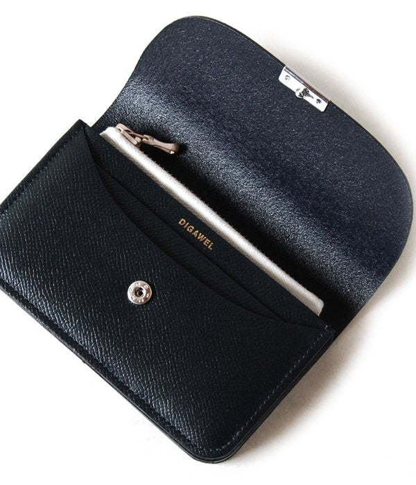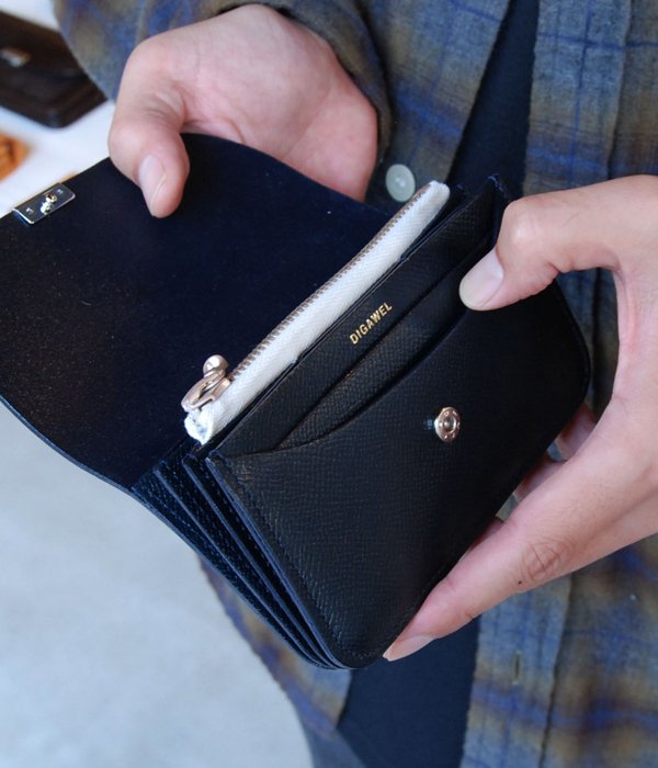 DIGAWEL(ディガウェル)が定番でリリースしているギャルソンパースのカーフレザータイプ。パリのギャルソンがテーブルでのチェックの際に使う大きな小銭入れとジャバラが特徴の大容量の財布をモチーフに、ポケットにも入る絶妙なサイジングに再構築。小銭入れのファスナーにはもちろん白金加工のriri zipが光ります。