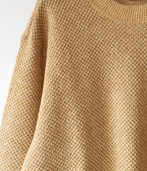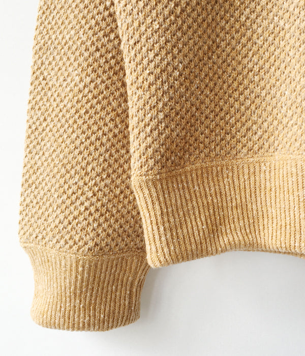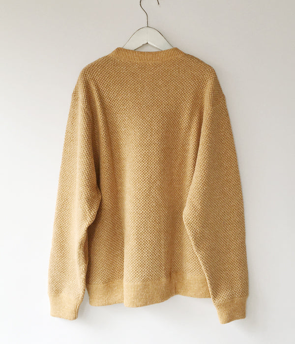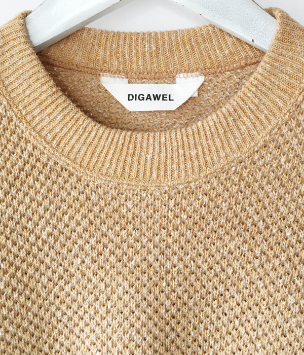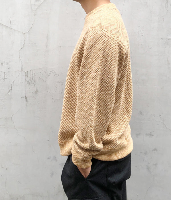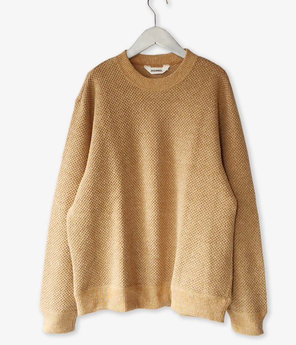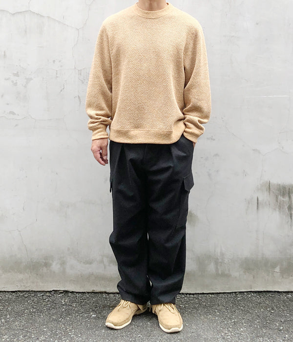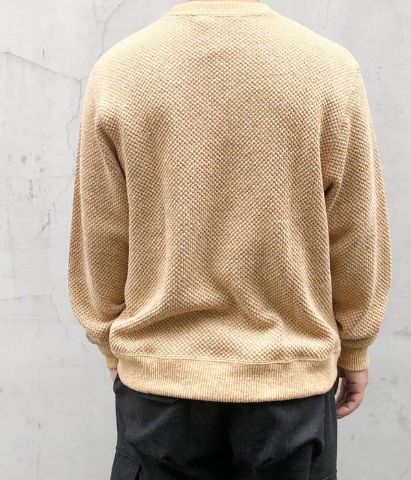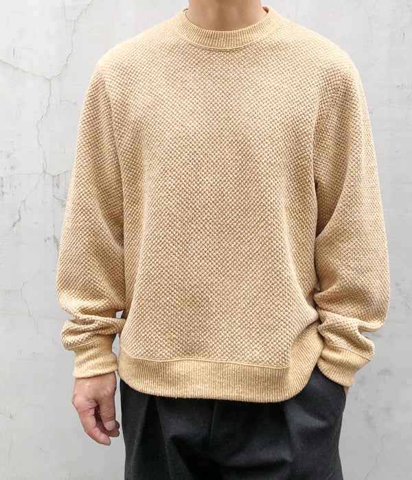 DIGAWELから、HEXAGONAL PATTERNS SWEATSHIRTが入荷しました。リサイクル生地によるミックスニット素材を用いてヘキサゴンパターンを表現した淡い色合いのクルーネックニット。リブを設けたスウェットライクな仕上がりです。