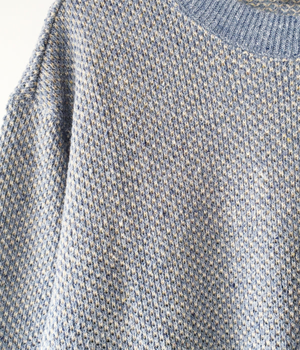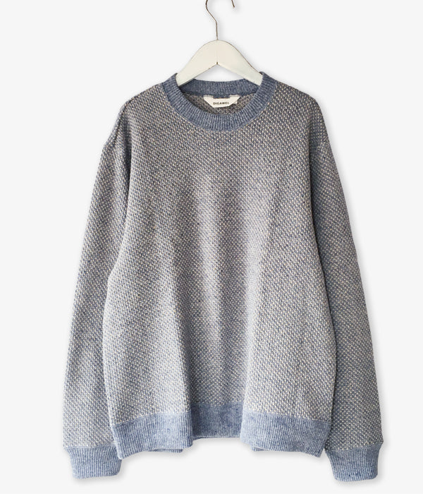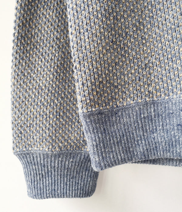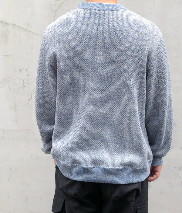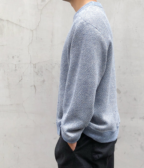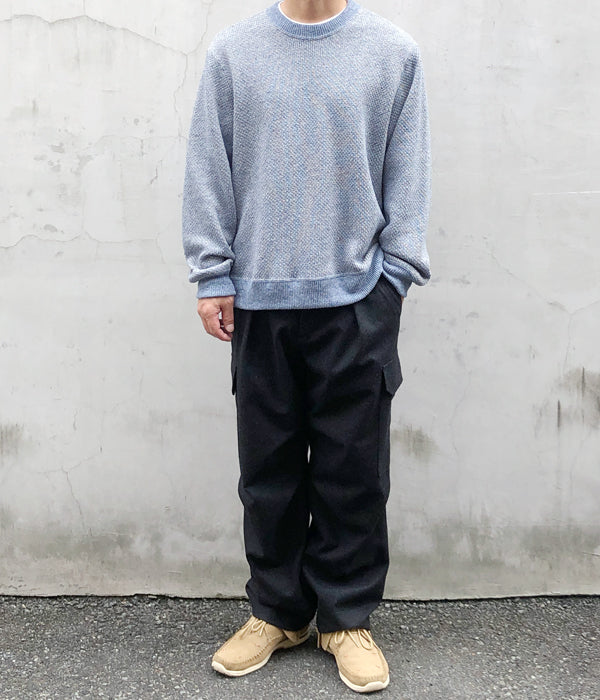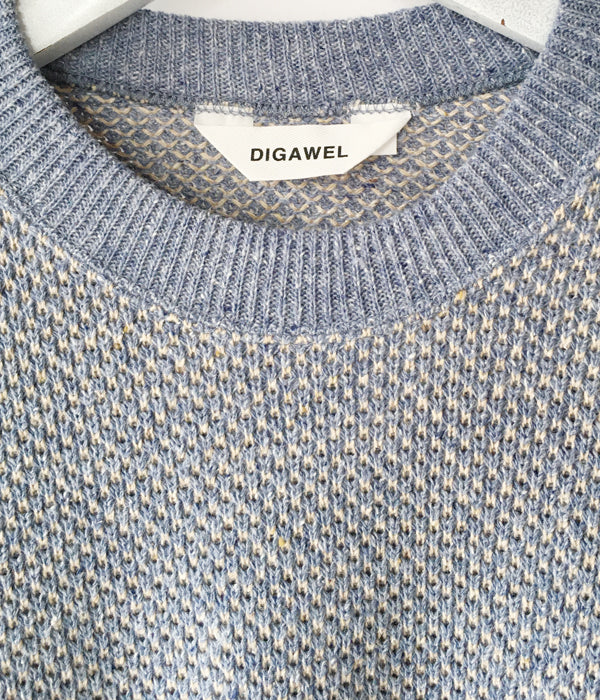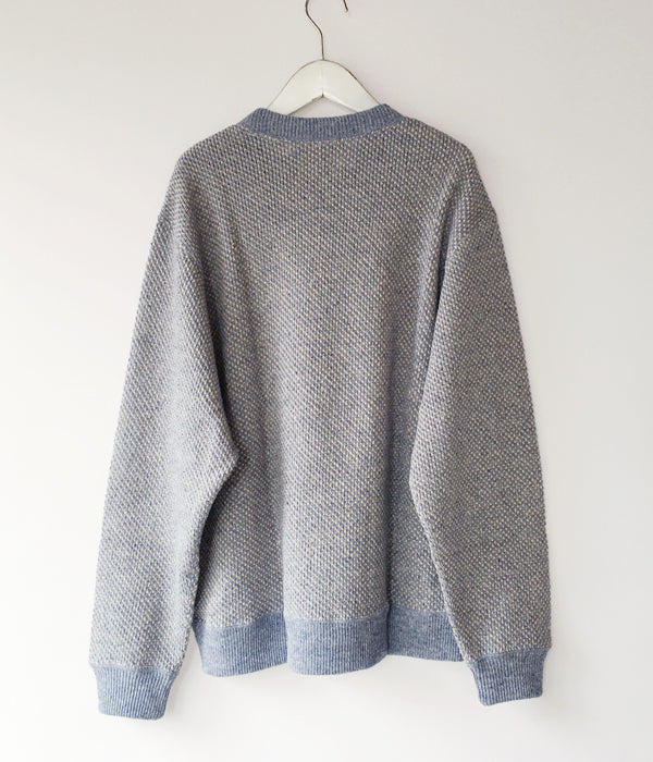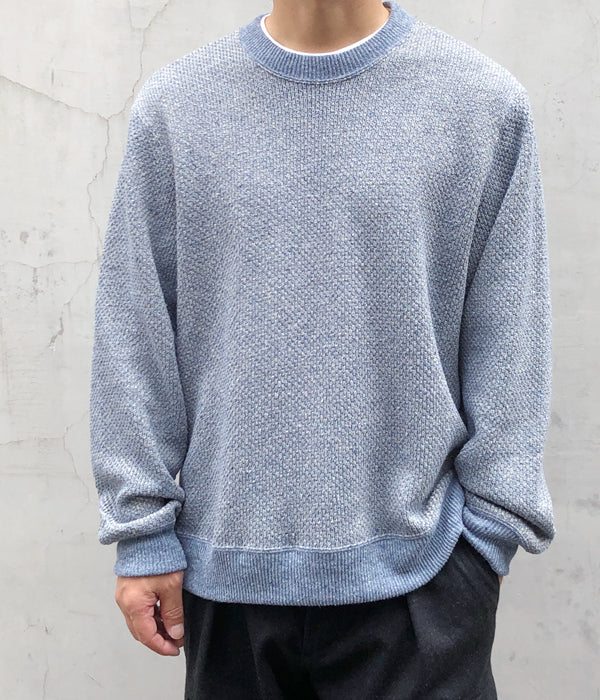DIGAWELから、HEXAGONAL PATTERNS SWEATSHIRTが入荷しました。リサイクル生地によるミックスニット素材を用いてヘキサゴンパターンを表現した淡い色合いのクルーネックニット。リブを設けたスウェットライクな仕上がりです。