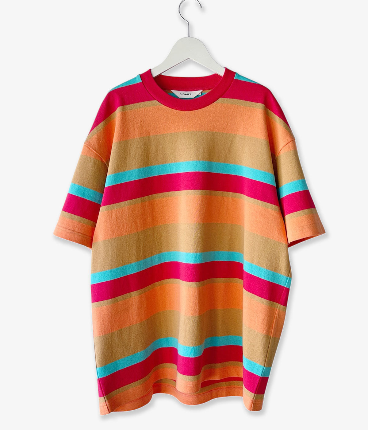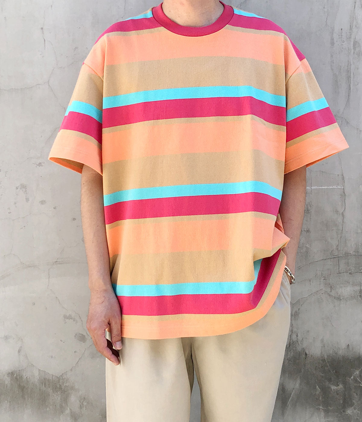 DIGAWELから、MULTI BORDER OVERSIZED T-SHIRTが入荷しました。16/2天竺を使用した厚手でしっかりとした風合いが特徴のボーダーTシャツ。広いピッチでカラフルなオリジナルボーダー柄を表現しました。ゆったりとしたサイジングで仕立てた1着。