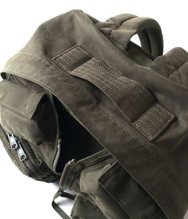 起毛感のあるスエードのような質感がエレガントなデイパック。それぞれ形状の異なる5個のポケットがもたらすデザイン性の高さと実用性が同居した作り。インナーにはPCスリーブを備えています。