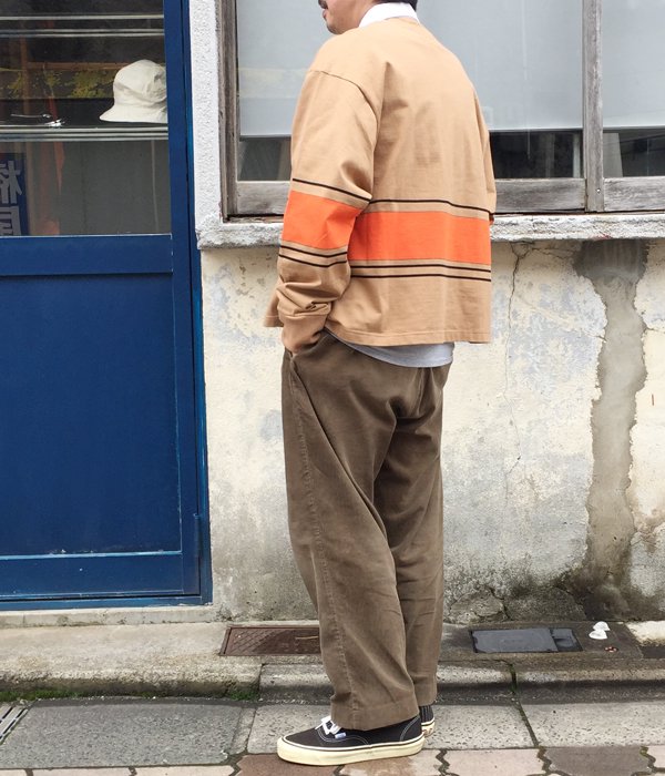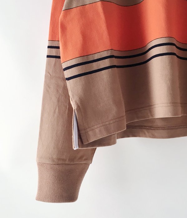 身幅と着丈がほぼ同寸法のBOXシルエットのラガーシャツ。比翼仕立てにラバーボタンと正統的なラグビーシャツの作りを体現しました。不均一なボーダー柄がポイント。