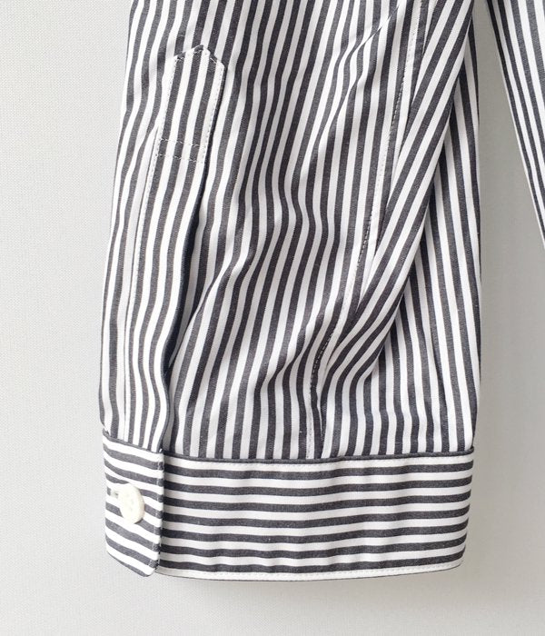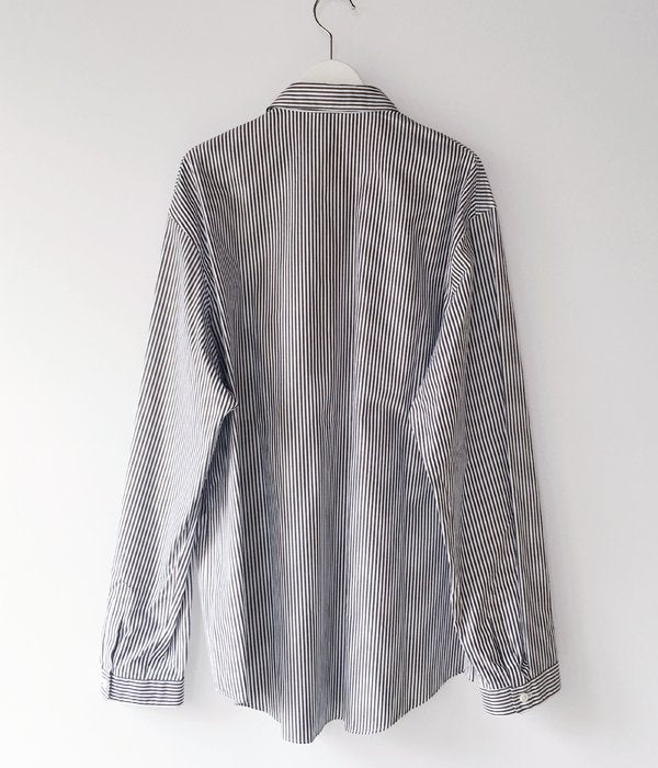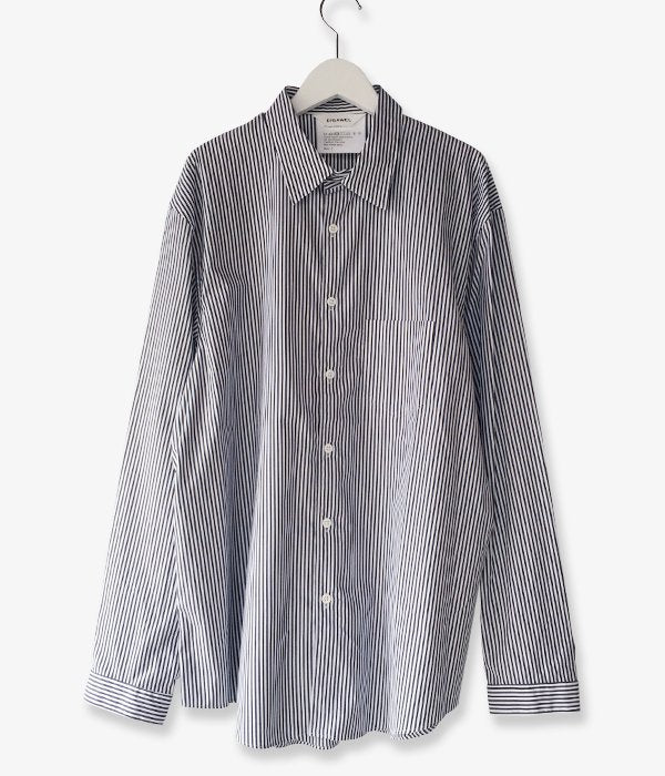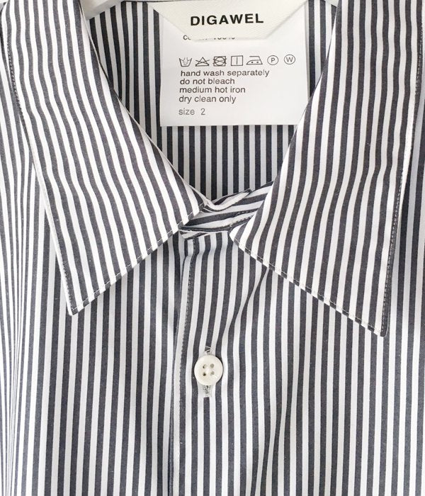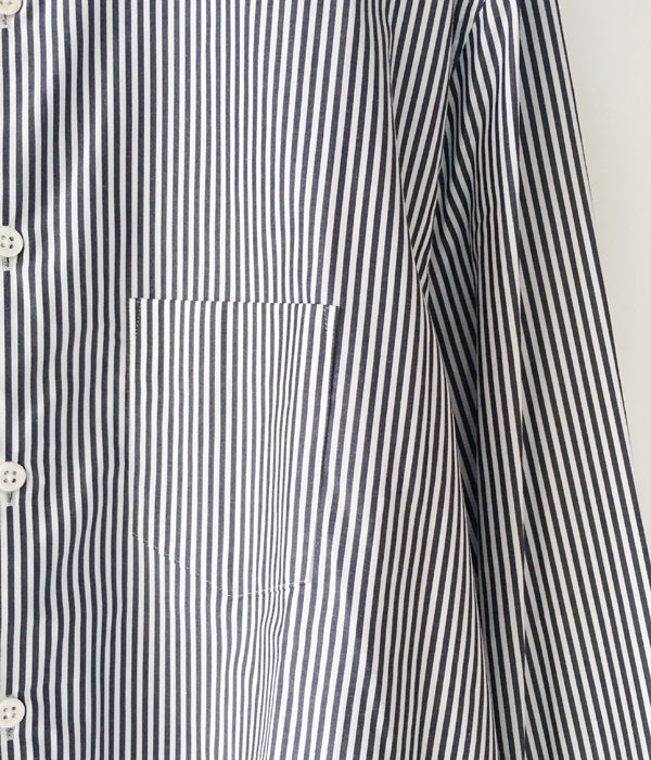 DIGAWELから、STRIPE SHIRTが入荷しました。2mm程度のピッチのストライプ柄シャツ。レギュラーカラーの襟元に小振りなカフス、胸にパッチポケット付きのデザイン。身幅の広めのゆったりとしたシルエットに仕上っています。