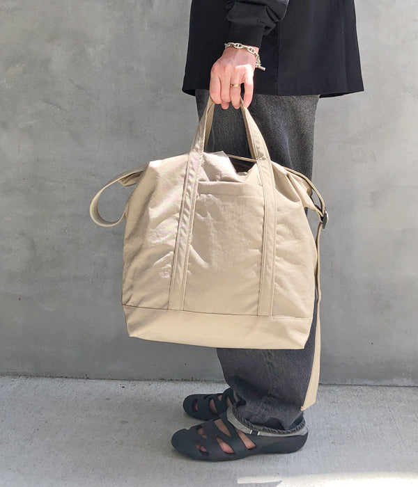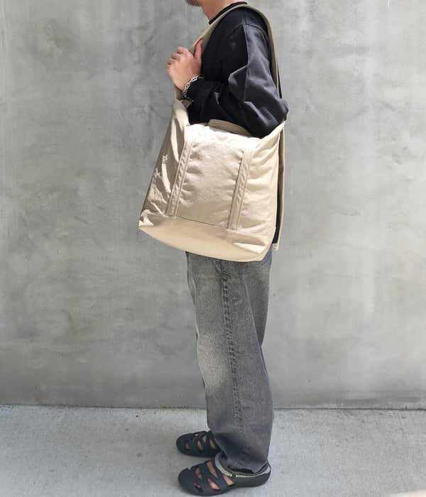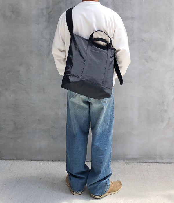 ERA.から、TAS HIBI 2 (ERA'S DAILY CARRIER pt:2)が入荷しました。コットンのような肌触りの撥水性タッサーナイロンを使用し、1940年代発の名作トートバッグに敬意を評した1型。内側の小分けポケットも充実しています。手持ちハンドルに加え、肩掛け、斜め掛けまで対応する調整可能なストラップ付の3WAY。ストラップ幅も広く着用感が良く、ホック付きの前ポケットなどユーザーのための優しい設計に溢れています。