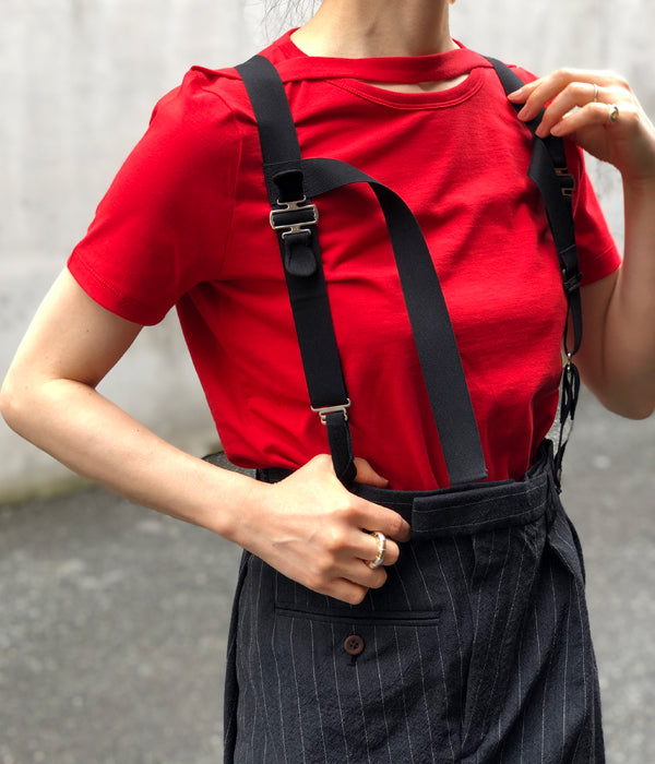 FUMIKA_UCHIDAからBONDAGE CHIBI SHORT-SLEEVE T-SHIRTが入荷しました。首元に拘束的な印象をもたらす1本のフライステープを両肩から渡し、首の前を通らせて着るショートスリーブTシャツ。洗い込んでも毛羽立ちが少なく風合いが損なわれない特性を持つ、度目を詰めて編み立てたオーガニックコットンのオリジナル生地を使用。ジャストショルダー、ややタイトでストレートな身幅でヒップ上丈のコンパクトなデザインとなります。