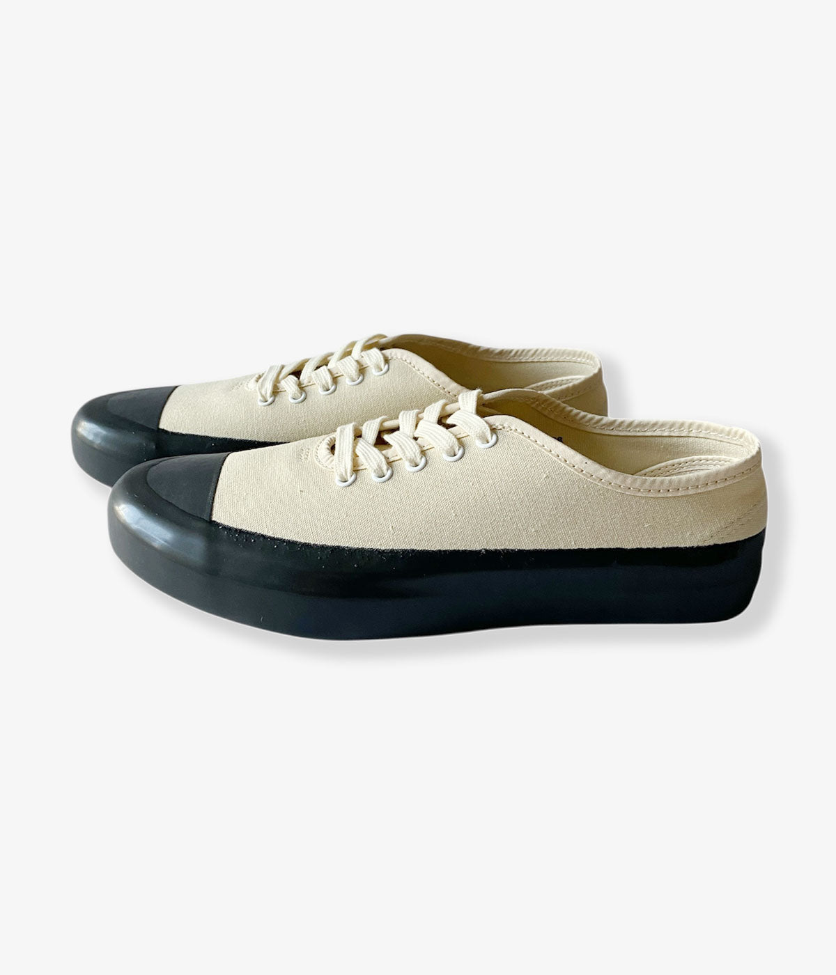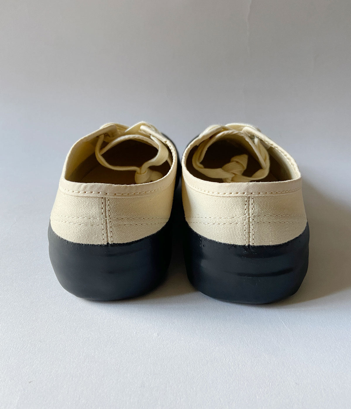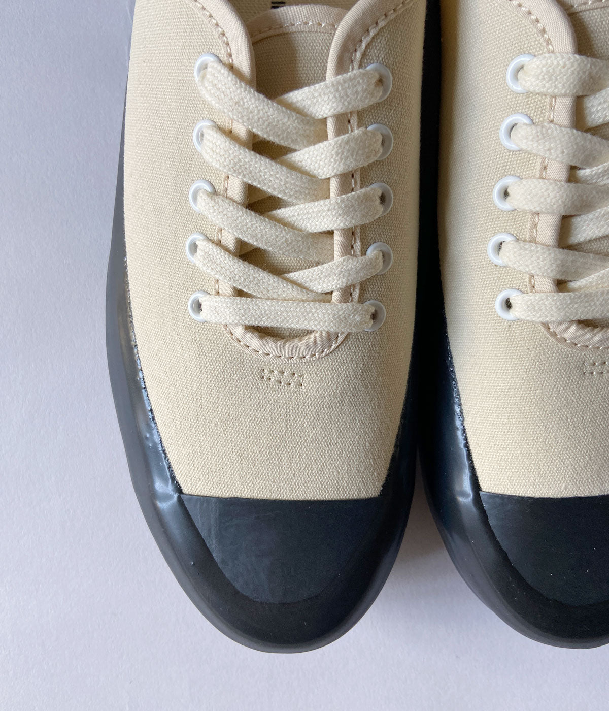 FUMIKA_UCHIDAからCANVAS SNEAKERSが入荷しました。2024SSリリースのスニーカーを新色で再リリース。ナチュラルなキャンバス生地を使用したローカットスニーカーにレインカバーを被せたような見え方をイメージしデザイン。今回はセミマットな質感で艶、透明感を抑えたラバーでのコーティング。ラバー色はオリジナルカラーで作成。フロント5ホールのレースアップ。トゥーとサイドラバーにオーバーラップするようにラバーを手作業でコーティングしている為個体差の出るものになります。表記サイズより少し大きめの作りになっています。サイズは前回と同じものになります。