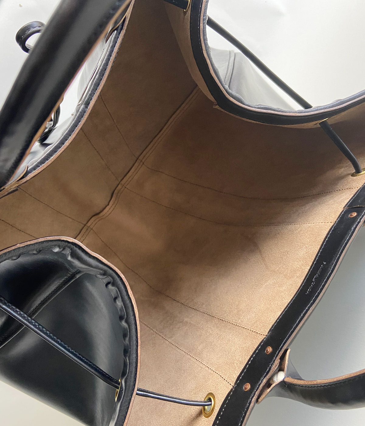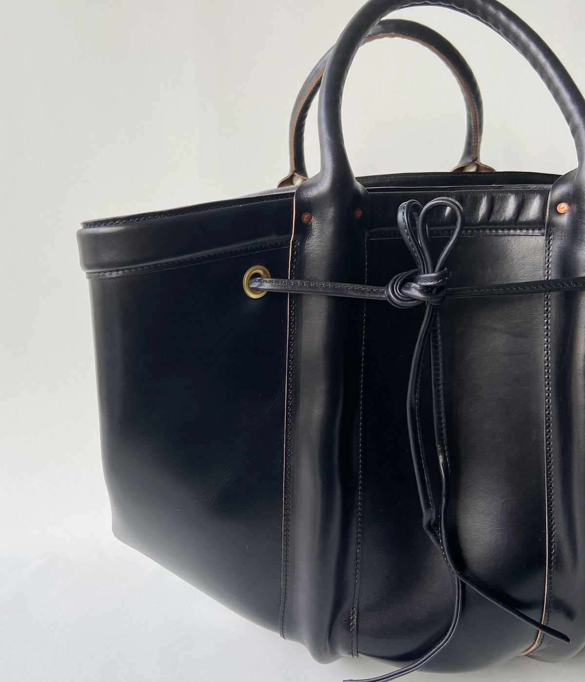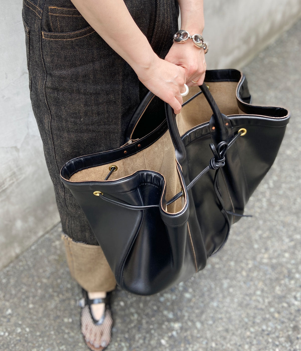 FUMIKA_UCHIDAからFUMIKA_UCHIDA CHACOLI CHROMEXCEL LEATHER CARPENTERS TOOL BAG:Lが入荷しました。ヴィンテージのツールバッグを重厚なクラシックレザーで再構築しました。ハンドルには芯材としてロープを仕込み、耐久性と安定感を高め、重い荷物も安心して持ち運べる実用的な設計に仕上げています。バッグ本体には100年以上の歴史を持つアメリカン・シカゴのHorween Leather Companyによって製造されている高品質な牛革で、一般的にはワークブーツやエンジニアブーツのアッパー用として使われることが多い素材です。油分が多く含まれるためしなやかで柔らかく、自然な光沢と使用を重ねることで現れる美しい経年変化が特徴です。