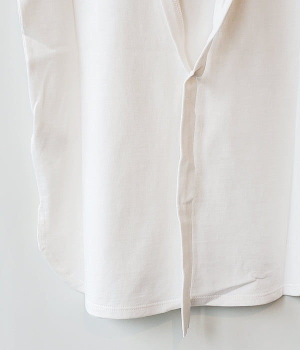 FUMIKA_UCHIDAからDOUBLE NECK NO-SLEEVE TANKTOPが入荷しました。首元にフライステープが付くダブルネックのタンクトップ。洗い込んでも毛羽立ちが少なく風合いが損なわれない特性を持つ、度目を詰めて編み立てたオーガニックコットンのオリジナル生地を使用。左右で生地の地の目の使い方を変えたフライステープが背中で輪になって繋がり、首の前後自由に垂らして形作るディテールに。体に隙間を作りながらフィットするシルエットのヒップ丈、左右の裾にスリットの入ったデザインとなります。