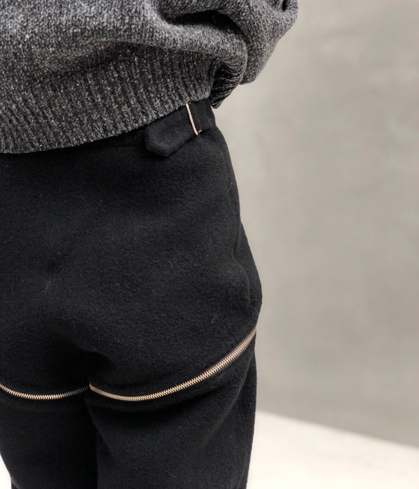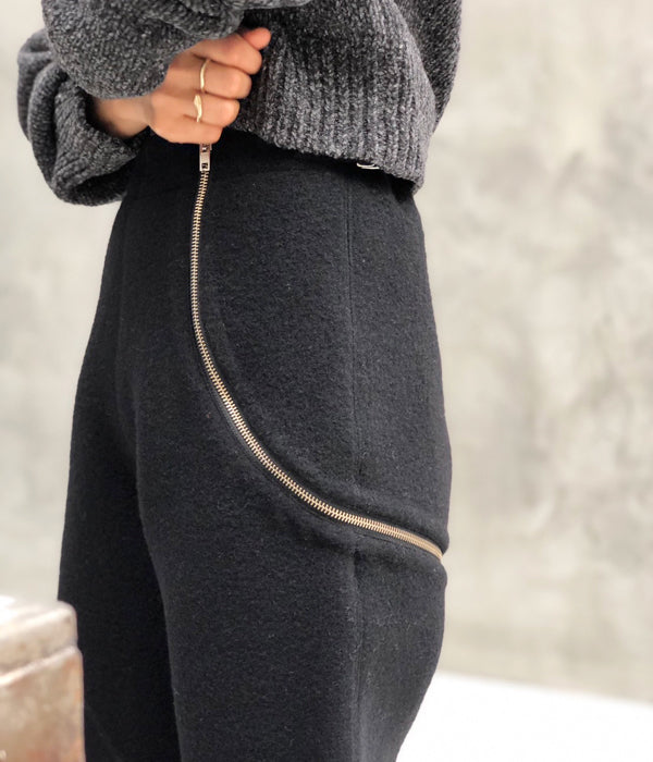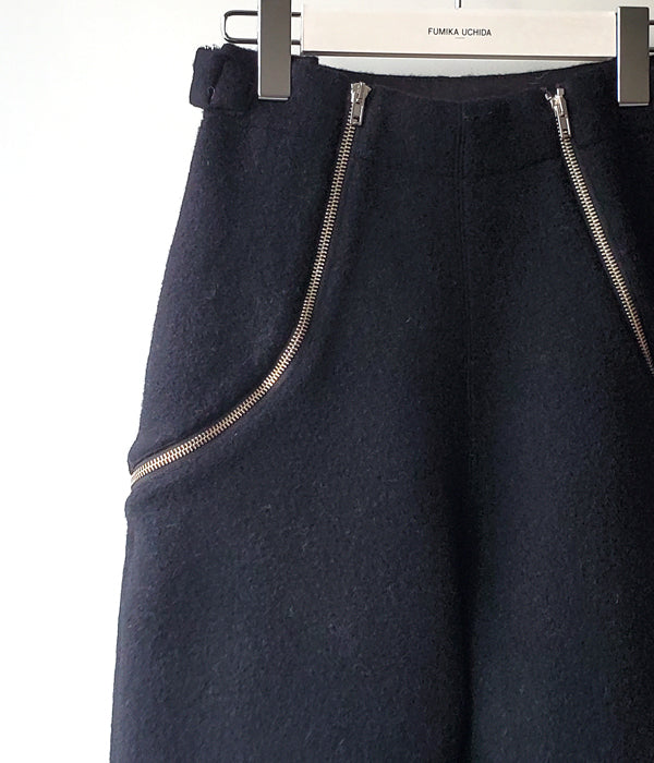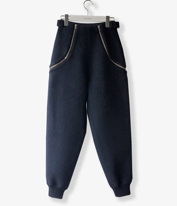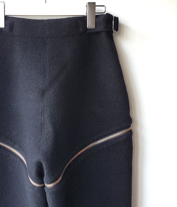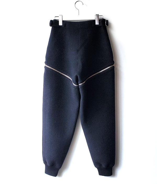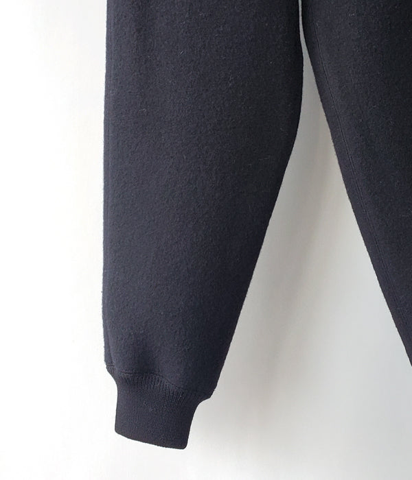 FUMIKA_UCHIDAからFULLING W-FACE TRACK PANTSが入荷しました。ラムウールを使用したソフトなタッチのダブルフェイス生地で作るトラックパンツ。ウエストからヒップわたりをぐるりと回る左右対称なファスナーが付くデザイン。広めのわたりで膝下をすっきりと絞り、裾にはリブ。リバー縫製でファスナーを挟み込む仕立てとなっています。