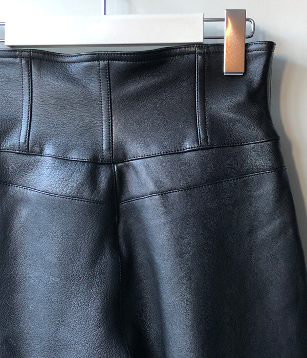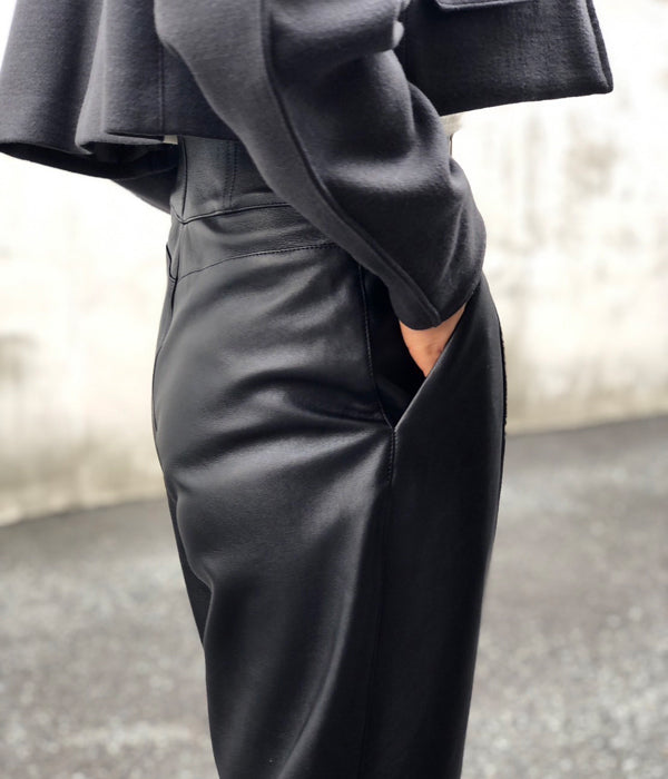 FUMIKA_UCHIDAからLEATHER ONE-TUCK PANTSが入荷しました。ウエストにコルセットのディテールをのせたレザーパンツ。ウエスト、ヒップ上はフィットさせ、腰骨位置に入るワンタックでヒップ下、わたりにはゆとりが。テーパードラインのくるぶし丈で短めのレングスです。