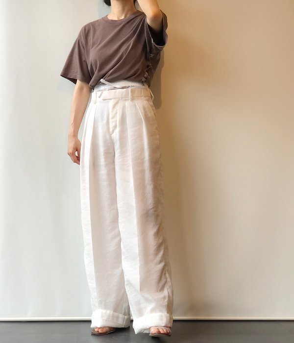 FUMIKA_UCHIDAからMonofilament/DOUBLE-WAIST REVERSIBLE SLACKSが入荷しました。リネンとナイロンモノフィラメントを織り合わせたボイルの表地とオーガンジーの組み合わせで作る2タックスラックス。表のリネン側はスタンダードなスラックスの中にインナーショーツのゴム入りウエストが見えるダブルウエストデザイン。裏のオーガンジーのインナーショーツを表にして履くこともできるリバーシブル構造。ジャストウエストで深い股上とリラックス感のあるヒップ、ワタリから裾までワイドにまっすぐ落ちるシルエットは先シーズンのレーヨンウールワイドスラックスの寸法がベースとなっています。