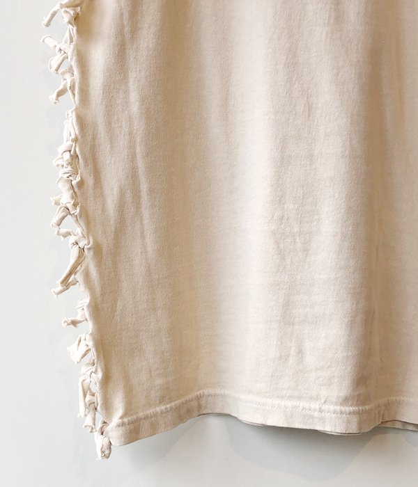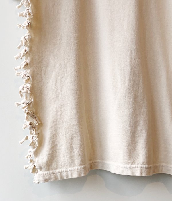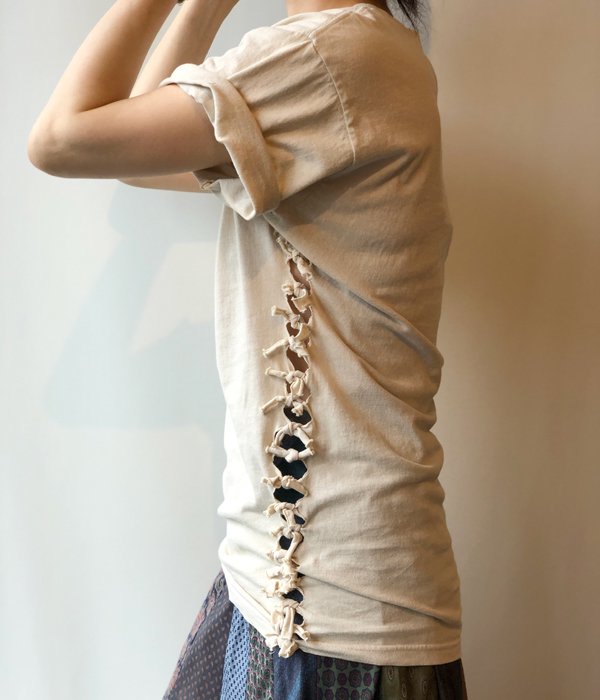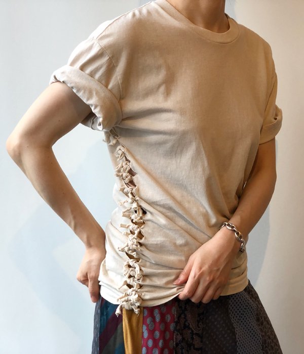 FUMIKA_UCHIDAからOVERDYED SIDE SHIRRING TEEが入荷しました。等間隔に切り込んだ身幅をひとつひとつ手作業で結び、連続するノットがアウトラインを形成するショートスリーブカットソー。ドライタッチでふっくらとした厚みがありながら軽さのある生地は、製品加工をすることで何色と表現し難い色合いと実験的な雰囲気に仕上がっています。長めの丈を活かし、たくし上げたり裾を結んだりとバランスを見ながら変化をつけて着用いただけます。