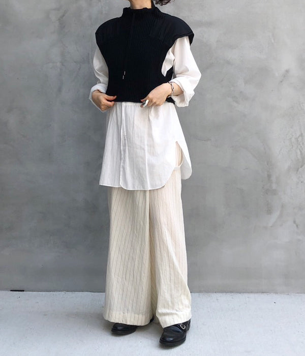 FUMIKA_UCHIDAからRIB KNIT PATCHED SLEEVELESS SWEATERが入荷しました。ウエストラインまで大きく開いたアームホールのウエスト丈ノースリーブセーター。肩のパッチの中側に肩パットが入り、丸みのあるオーバーショルダー。前後の着丈に差をつけラウンドした裾。肩からウエストにかけて逆三角形のシルエットになっています。