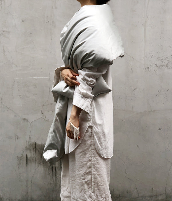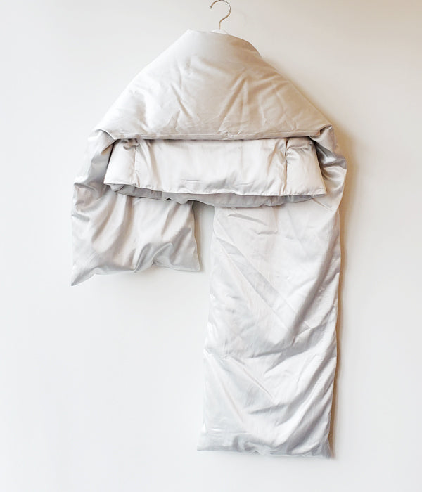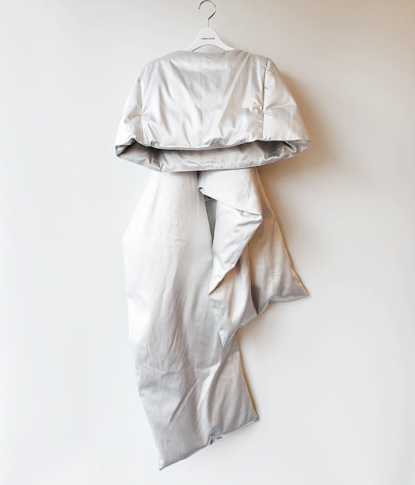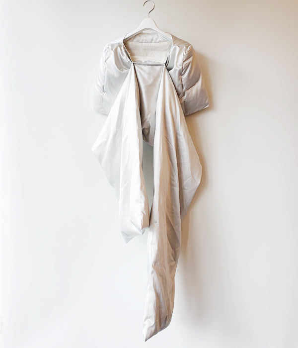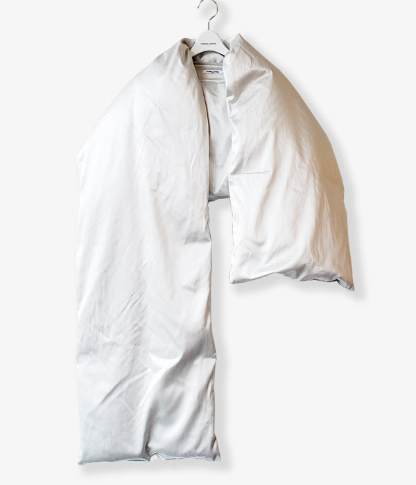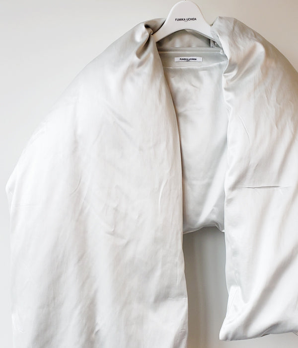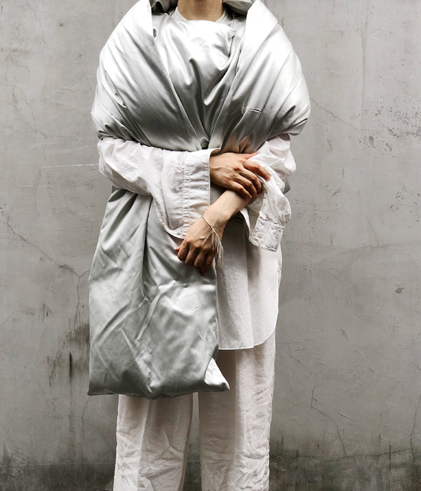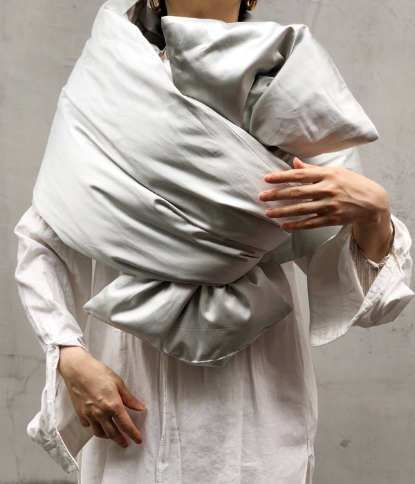 FUMIKA_UCHIDAからsatin/PADDING FUTON PONCHOが入荷しました。20WSのストールポンチョをサテン生地とダウンを使い再構築。ポンチョ部分とストール部分でダウンの分量を変え布団を巻いているような見え方に。マットな艶感とドレープ性のある独特な素材感とパーツの様なデザインを活かし防寒は勿論、ファッション的なコーディネートも楽しみたいITEMです。
