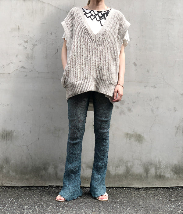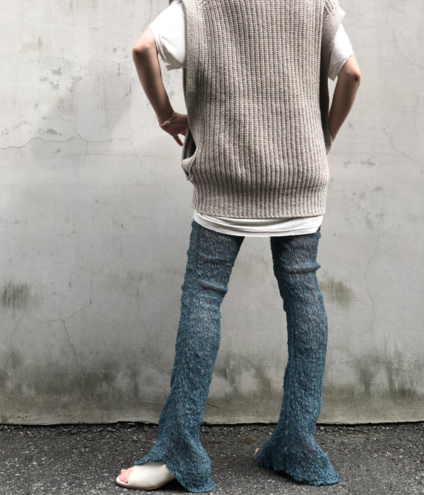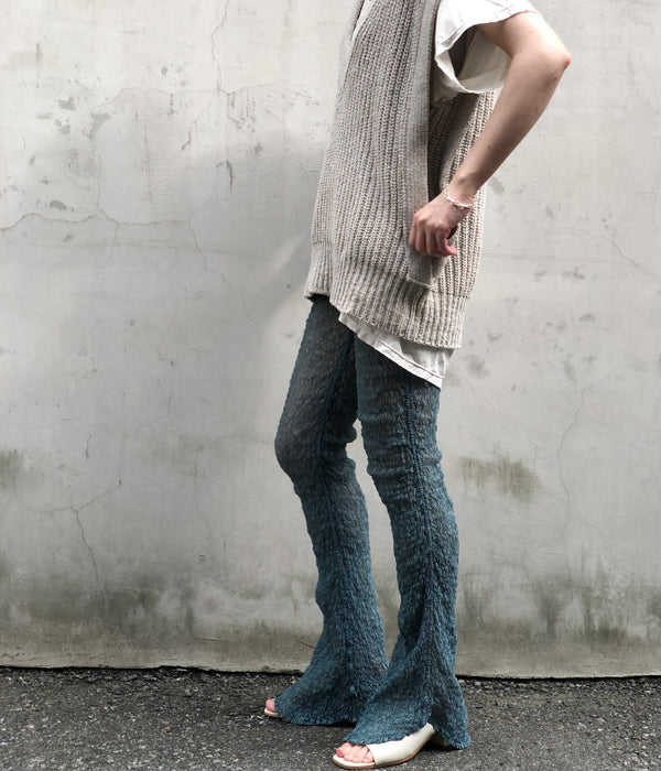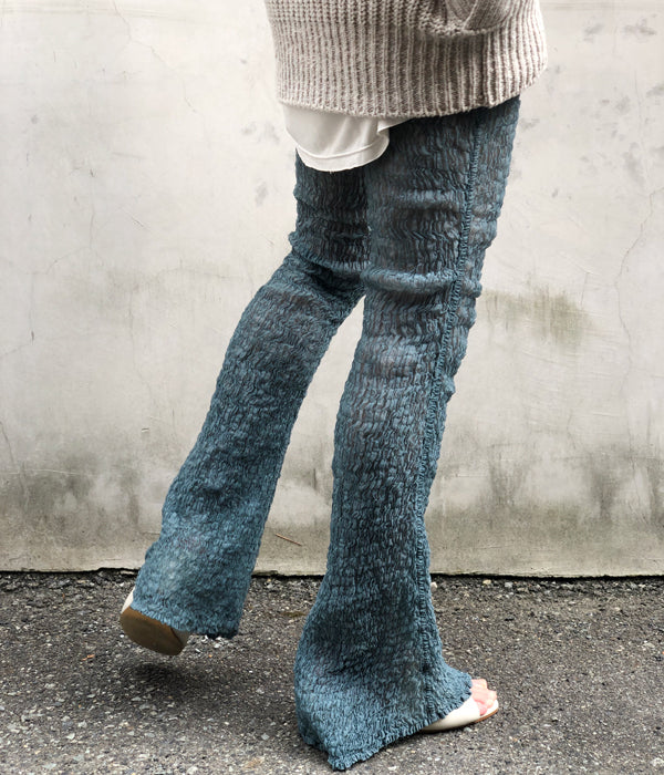 FUMIKA_UCHIDAからShirring Nylon/UNDER PANTSが入荷しました。18SSのコットン素材のシュリンク生地をナイロンに替えて透け感のある素材に再構築、作成したフルレングスのフレアーパンツ。製品染めによる糸の収縮で生地に凸凹が生まれ薄手ながら表情のあるユニークな佇まい。ゴム入りのハイウエストから膝まで柔らかくフィットする履き心地とフレアシルエット、ニュアンスのあるカラーもポイントです。透ける事を前提にコーディネートを考えるのが楽しいITEM。一枚で履く時はレギンスやタイツを下に着用すると透けが気にならなくなります。