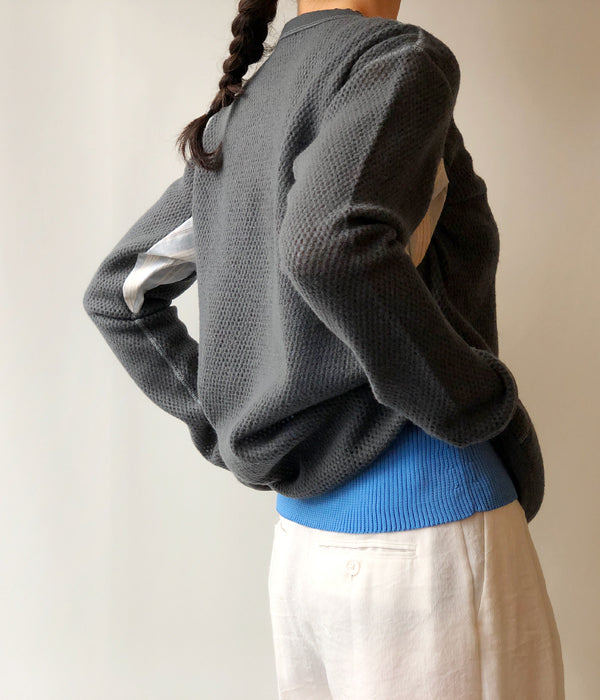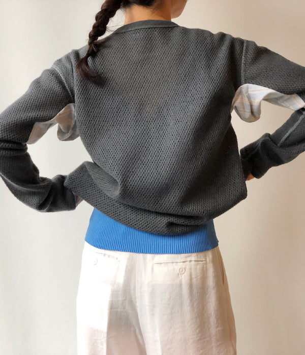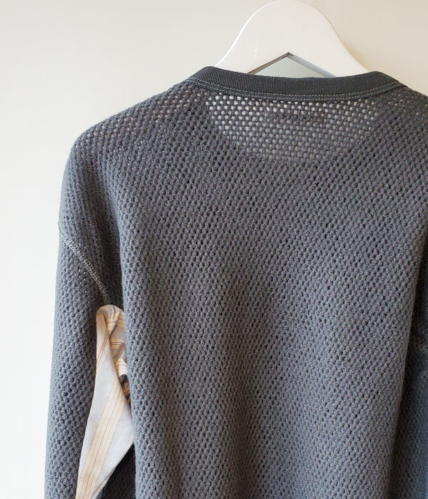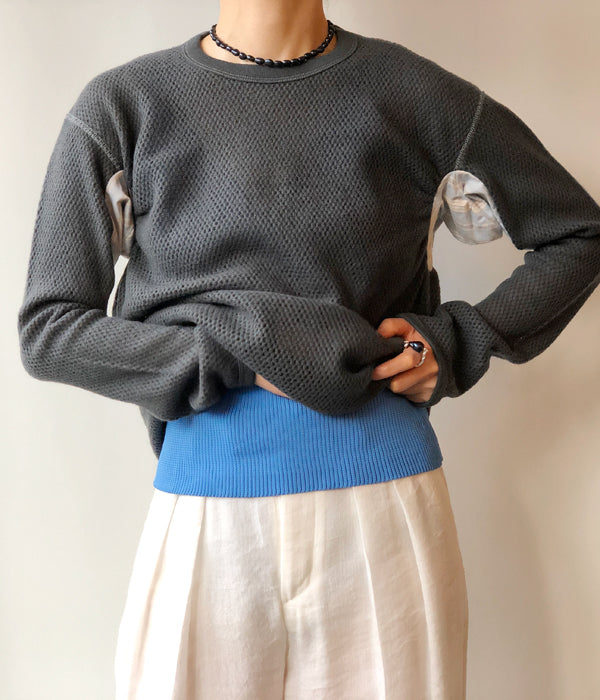 FUMIKA_UCHIDAからStriped Flannel Wool Mesh LONG-SLEEVE THERMALが入荷しました。ウール素材のメッシュ生地とストライプフランネルで作られたサーマルカットソー。縮んで小さくなった洋服の身幅を広げるためにマチをつけ、直して着るという古い時代の雰囲気を持たせたデザインです。ゆとりのある身幅に付くマチは縮んだようにギャザーが入り、裾は歪んだアウトラインに。製品加工の為、生地の表情やサイズに違いがあるのもデザインのひとつと捉えたITEMとなります。