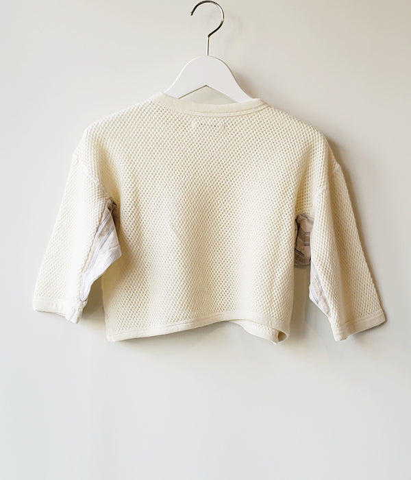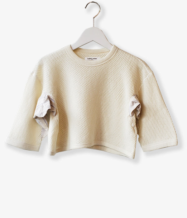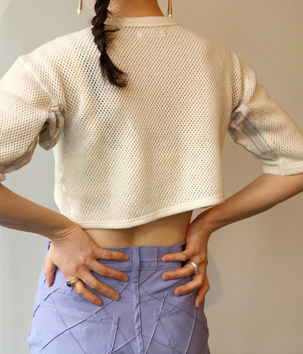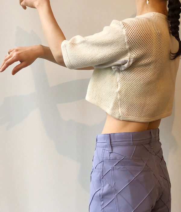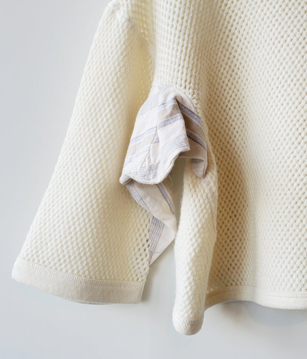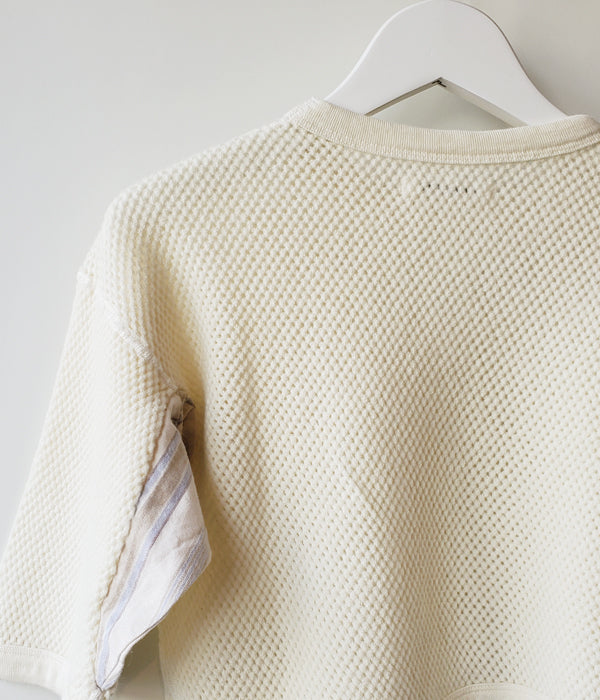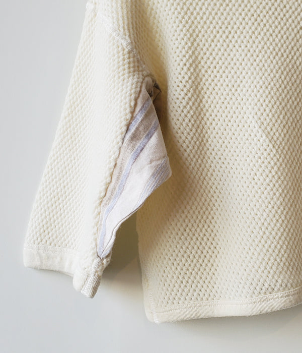 FUMIKA_UCHIDAからStriped Flannel Wool Mesh SHORT-SLEEVE THERMALが入荷しました。ウール素材のメッシュ生地とストライプフランネルで作られた5分袖のサーマルカットソー。縮んで小さくなった洋服の身幅を広げるためにマチをつけ、直して着るという古い時代の雰囲気を持たせたデザインです。ゆとりのある身幅から少し広がり歪んだ裾は体から浮くようなイメージの着用感。製品加工の為、生地の表情やサイズに違いがあるのもデザインのひとつと捉えたITEMとなります。