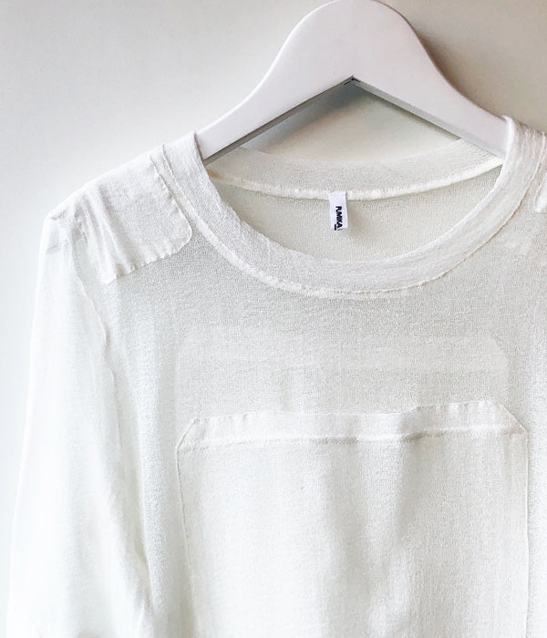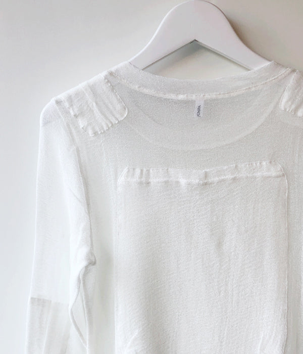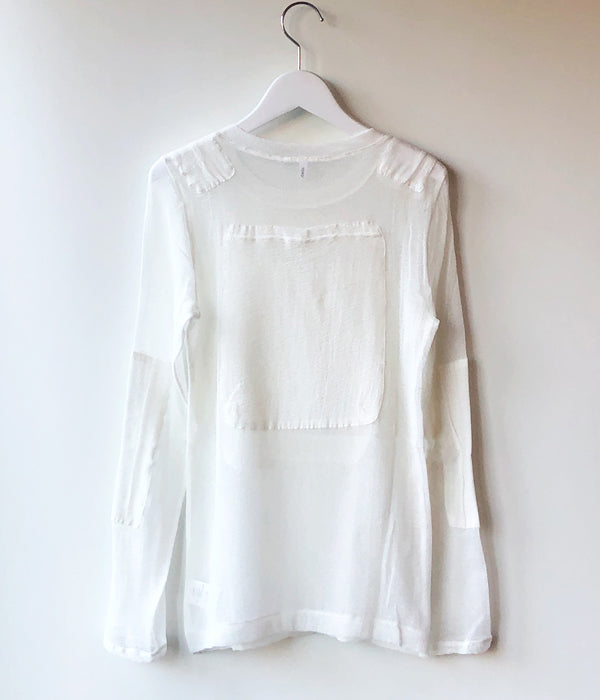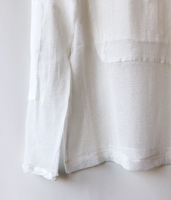 FUMIKA_UCHIDAからTACTICAL POCKET MESH LONG-SLEEVE TOPが入荷しました。ガーゼのような中性的な肌の透け方をするオリジナルのカラミ生地で作られたロングスリーブトップス。ストレッチ性のあるシルクコットンの糸をカラミ織機を使い繊細な織物をカットソーのように仕立て使用しています。ジャストショルダーで直線的なシルエット、肩位置のパッド、前後に付く大きいポケットなどミリタリーのディテールもデザインのポイントです。