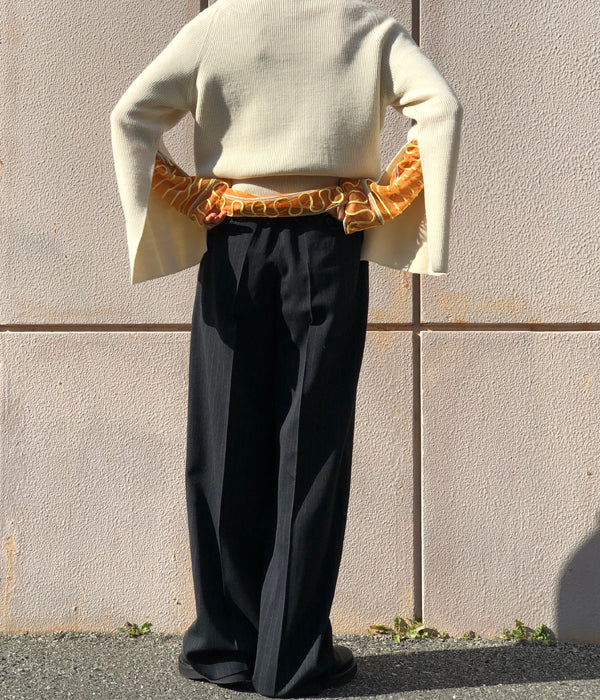 FUMIKA_UCHIDAからThick 2 Types Pinstriped/WIDE SLACKSが入荷しました。微妙に濃度が異なるチャコールグレーのヘリンボーン組織に2パターンのピンストライプをそれぞれに入れたオリジナル生地を使用の2インタックワイドスラックス。深い股上からの2タックで前後にボリュームを出しながらヒップラインは高めにすっきり見せ、ワタリから裾まで太さのあるシルエットと長いレングスのデザインは先シーズンからの継続型。ピンストライプのコンサバティブさとスタンダードなシルエットはニットやサーマルなどカジュアルでゆるさのある崩したバランスでの着用がおすすめです。