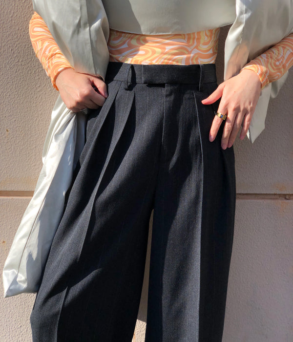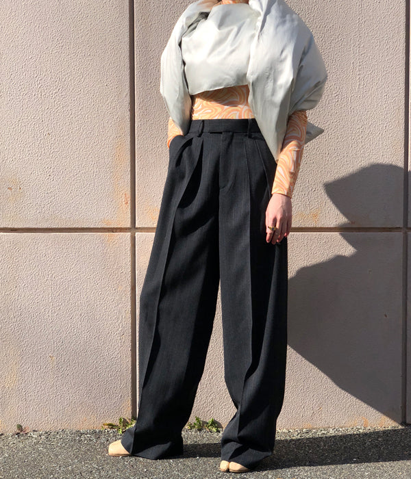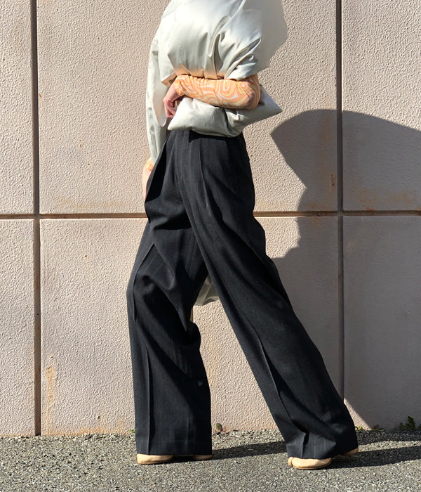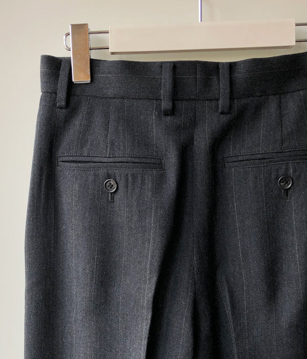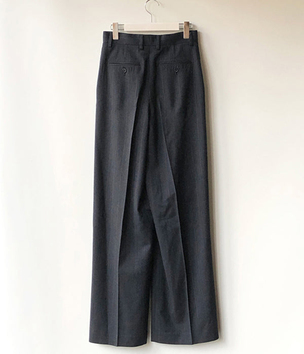 FUMIKA_UCHIDAからThick 2 Types Pinstriped/WIDE SLACKSが入荷しました。微妙に濃度が異なるチャコールグレーのヘリンボーン組織に2パターンのピンストライプをそれぞれに入れたオリジナル生地を使用の2インタックワイドスラックス。深い股上からの2タックで前後にボリュームを出しながらヒップラインは高めにすっきり見せ、ワタリから裾まで太さのあるシルエットと長いレングスのデザインは先シーズンからの継続型。ピンストライプのコンサバティブさとスタンダードなシルエットはニットやサーマルなどカジュアルでゆるさのある崩したバランスでの着用がおすすめです。