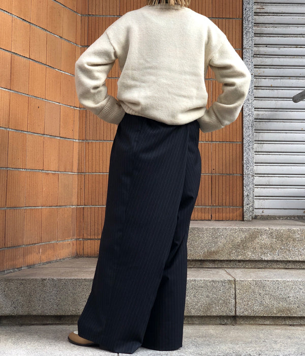 FUMIKA_UCHIDAからThin 2 Types Pinstriped/SIDE-FRONT SLACKSが入荷しました。微妙に濃度が異なるチャコールグレーのヘリンボーン組織に2パターンのピンストライプをそれぞれに入れたオリジナル生地を使用。的外れなくらい大きなサイズのスラックスを大きくねじって履く構造になっていて、重なるように前後にセパレートする太いレッグにそれぞれ足を通して着用します。サイドラインがフロントに来るよう構築されたアシンメトリーな見え方にはピンストライプのコンサバティブさを逆手に取った面白さがあります。