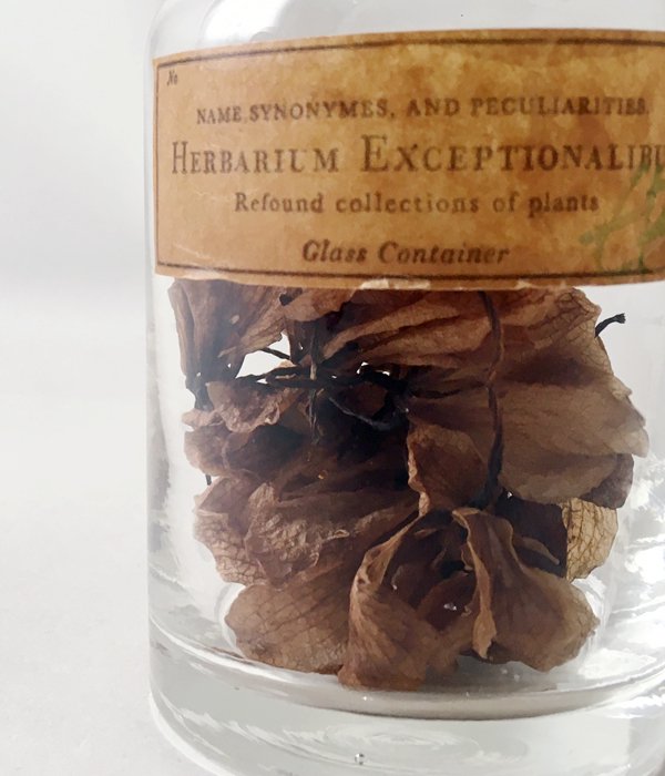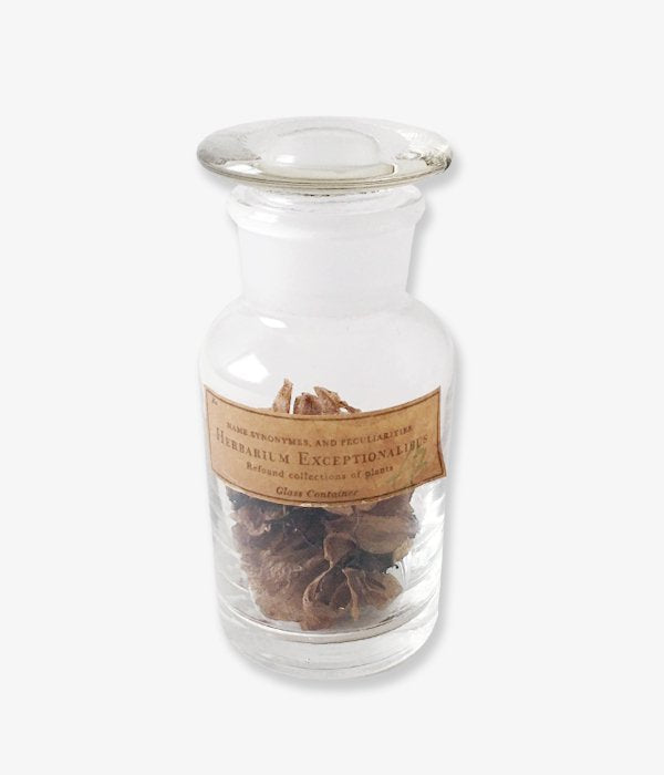 試薬瓶の中に乾燥植物を収納したGLASS CONTAINER Botanical( グラスコンテナ ボタニカル)。国内で数社、そこで働く僅かな職人さんのハンドメイドにて試薬瓶は作られています。過去に生物学者が植物を入れて標本にしていた事をヒントに、普段あまり見かけない乾燥した植物を収納しました。製壜業界と植物の再生をコンセプトにした博士の標本、お部屋のインテリアにいかがでしょうか?