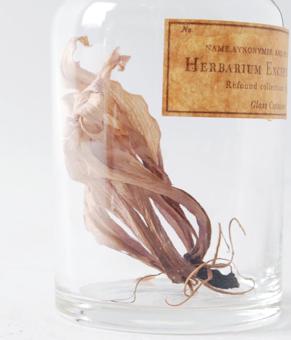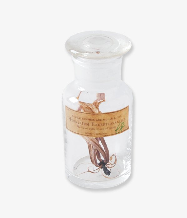 試薬瓶の中に乾燥植物を収納したGLASS CONTAINER Botanical( グラスコンテナ ボタニカル)。国内で数社、そこで働く僅かな職人さんのハンドメイドにて試薬瓶は作られています。過去に生物学者が植物を入れて標本にしていた事をヒントに、普段あまり見かけない乾燥した植物を収納しました。製壜業界と植物の再生をコンセプトにした博士の標本、お部屋のインテリアにいかがでしょうか?