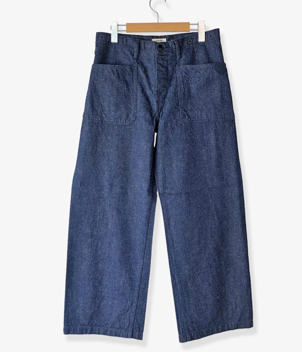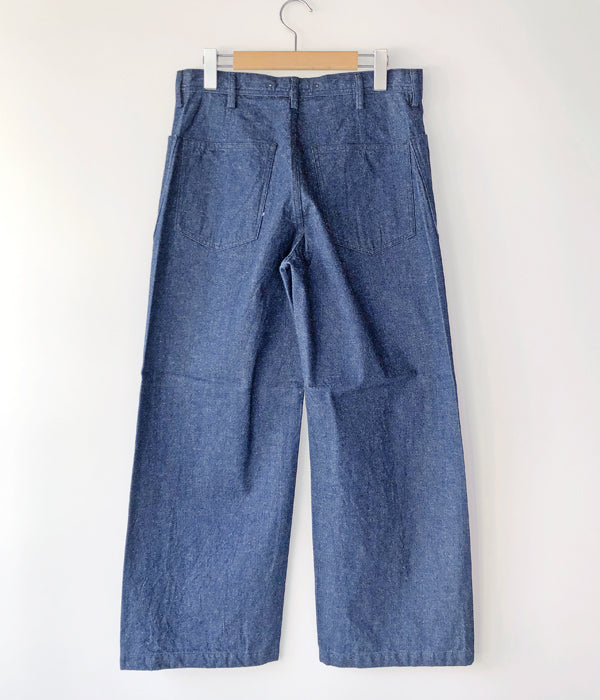 INTERIMから、1940's WW2 US.NAVY SELVEDGE NEP DENIM TROUSERが入荷しました。フロントのパッチポケットがアイコニックな40年代USネイビーのデニム製セーラーパンツをモチーフに仕立てた1着。ネップ感のあるワイルドな印象のセルビッチデニムを起用しワイドシルエットに仕上げました。所謂巻きパンツの仕様によるサイドシームのないデザインが特徴的なシルエットを演出します。