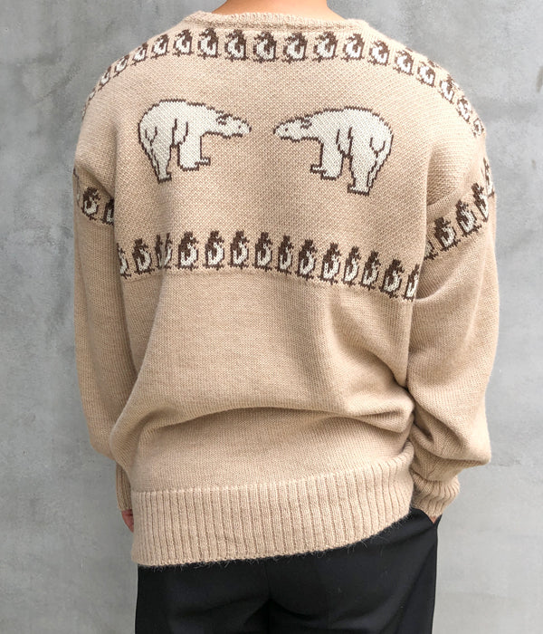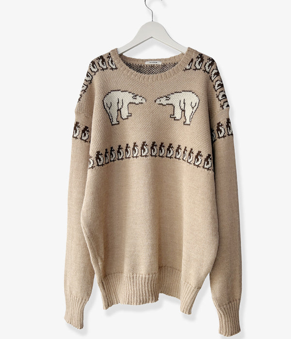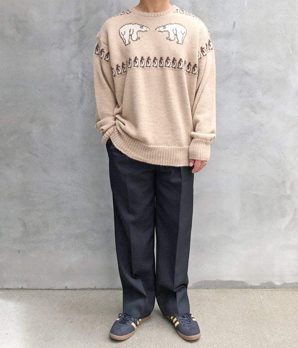 INTERIMから、40s ANIMAL JACQUARD ALPACA CREW SWEATERが入荷しました。シロクマ & ペンギンのかわいらしいモチーフがポイントのクルーネックニット。40年代のUSビンテージスキーセーターからピンポイントで着想を得たミドルゲージ編みによる1着。ペルー産の良質なアルパカを素材に用いて保温性が⾼く、上質な質感で着心地も抜群です。ギュッと絞りのきいたリブがグッドシルエットを演出します。
