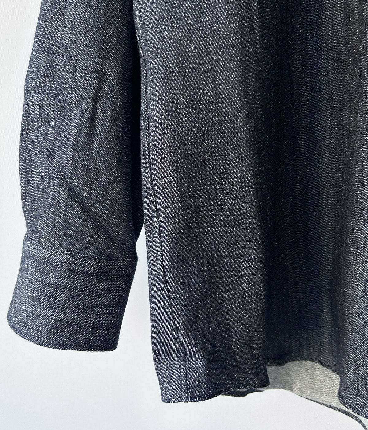 INTERIMから、7oz SILK DENIM L/S REGULAR COLLAR SHIRTが入荷しました。7ozシルクデニム⽣地を使用し、素材ならではのさらりとしたタッチと光沢感、上品なネップ感が特徴のレギュラーカラーシャツ。小振りなカラーに、シルエットはゆったりとしたサイジングながらも、、タックイン・アウトいずれにもマッチするバランス感に仕上げました。バストのパッチポケットでひかえめなワンポイント。