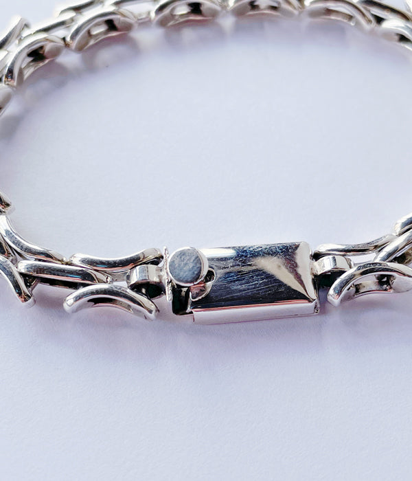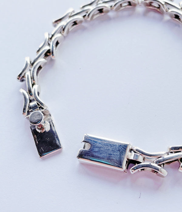 INTERIMから、TAXCO SILVER CRASP BRACELETが入荷しました。メキシコ タスコ製によるシルバー925を使用したハンドメイドジュエリー。ユニークな楕円形のモチーフをつなぎ合わせた美しいジュエリーです。押し込み式のワンタッチクラスプを使用したシンプルなデザイン。