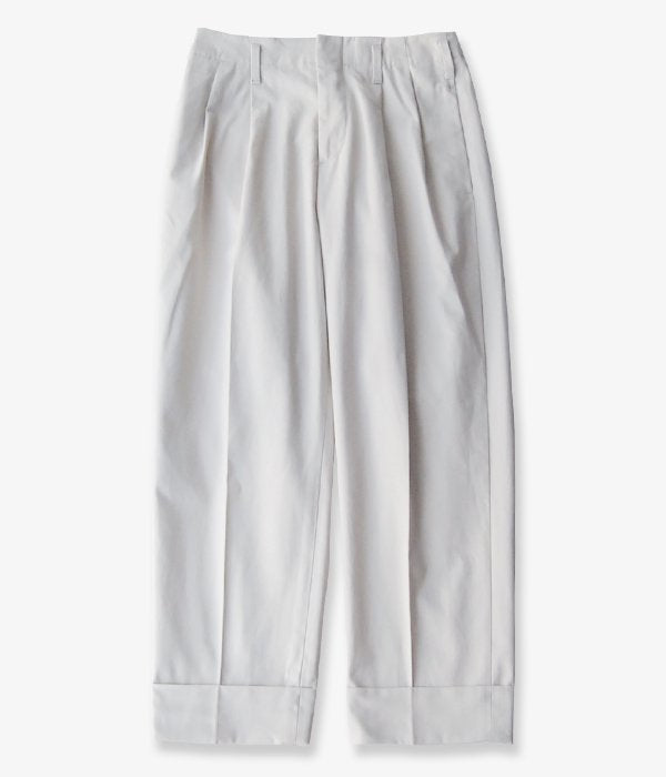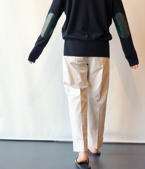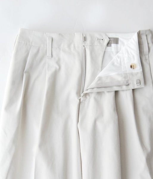 高密度で織られた張りのあるコットン素材のプリーツトラウザーズ。カジュアルながらもセンタープレス効果できちんとした印象に。様々なスタイルに幅広く合わせられる万能ボトムス。