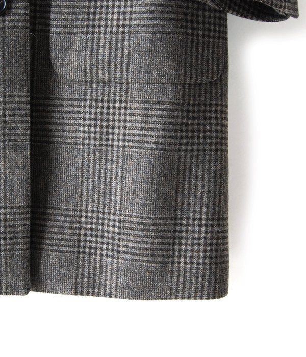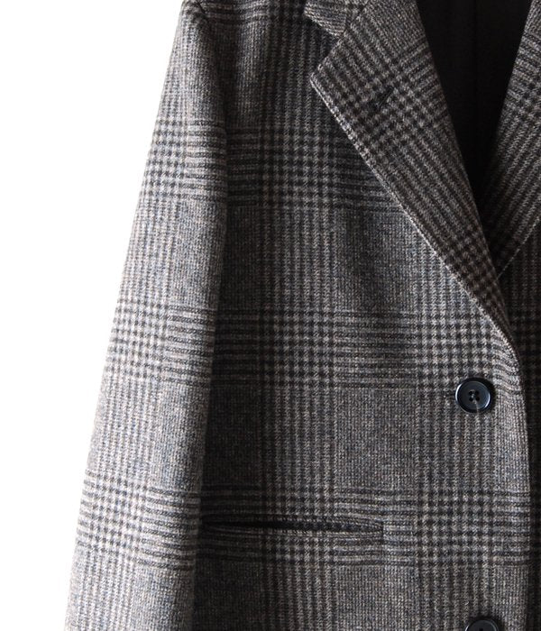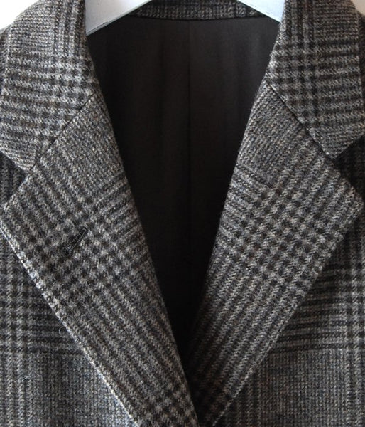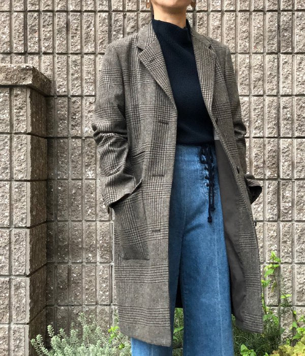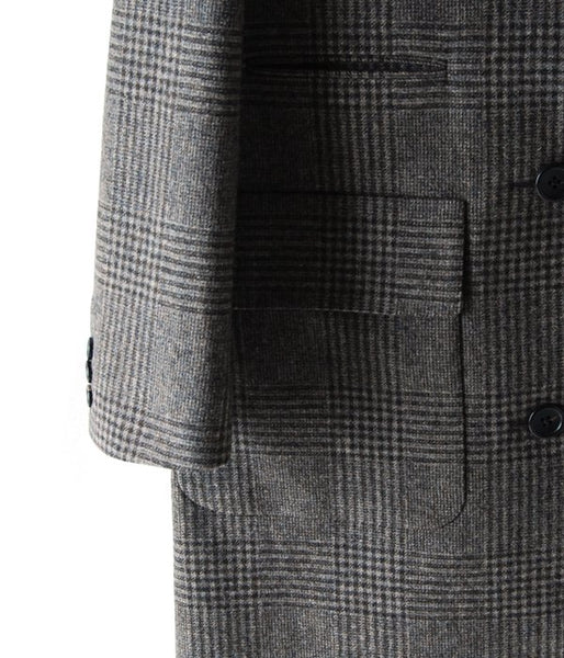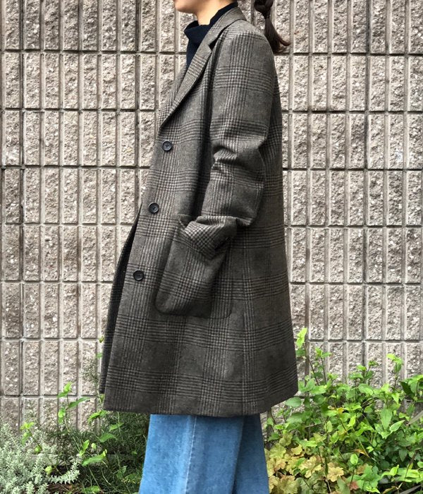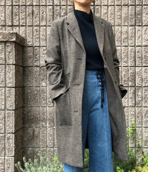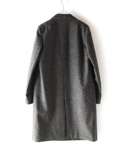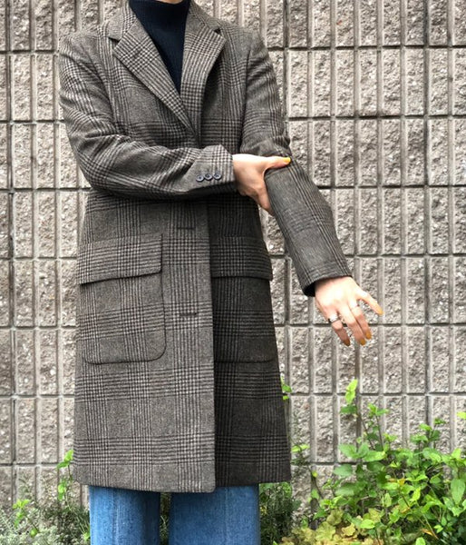 しっとりとした生地感で高級感があり、仕立ても素晴らしい正統派を思わせる佇まいのコート。ブラウン・カーキ・グレーなどの糸で織り上げられた一言では表現し難い絶妙カラーのチェック柄生地は、スコットランドのツイード生地メーカーLOVAT MILL社別注のもの。コンパクトな作りなのでジャケット感覚でも着用いただけます。