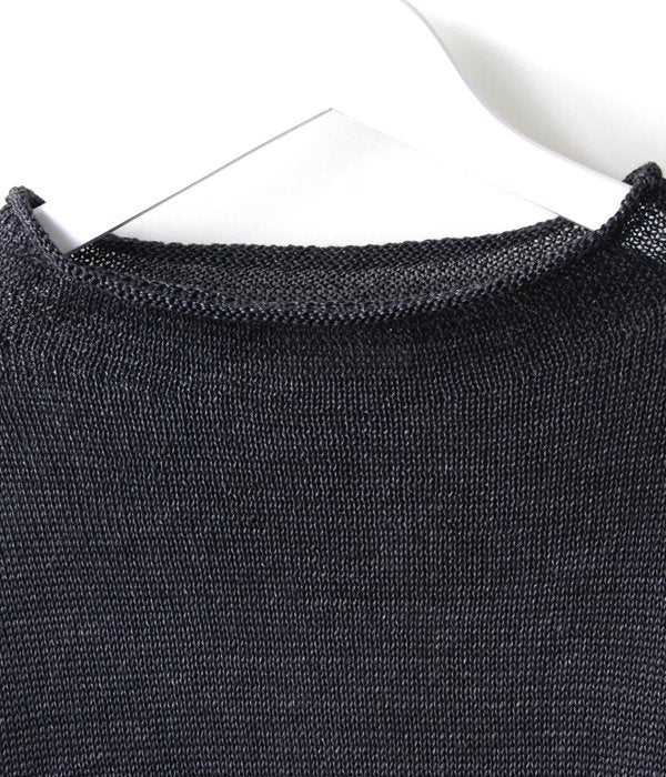 少し高めの衿がポイントのCNニット。特殊な染め方による色合いと、透け感のある素材感が特徴。