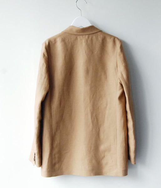 凸凹感のあるリネン素材を使用した表情が立体的なジャケット。肩パットを入れないことでこの時期にさっと羽織りやすく仕上がりました。